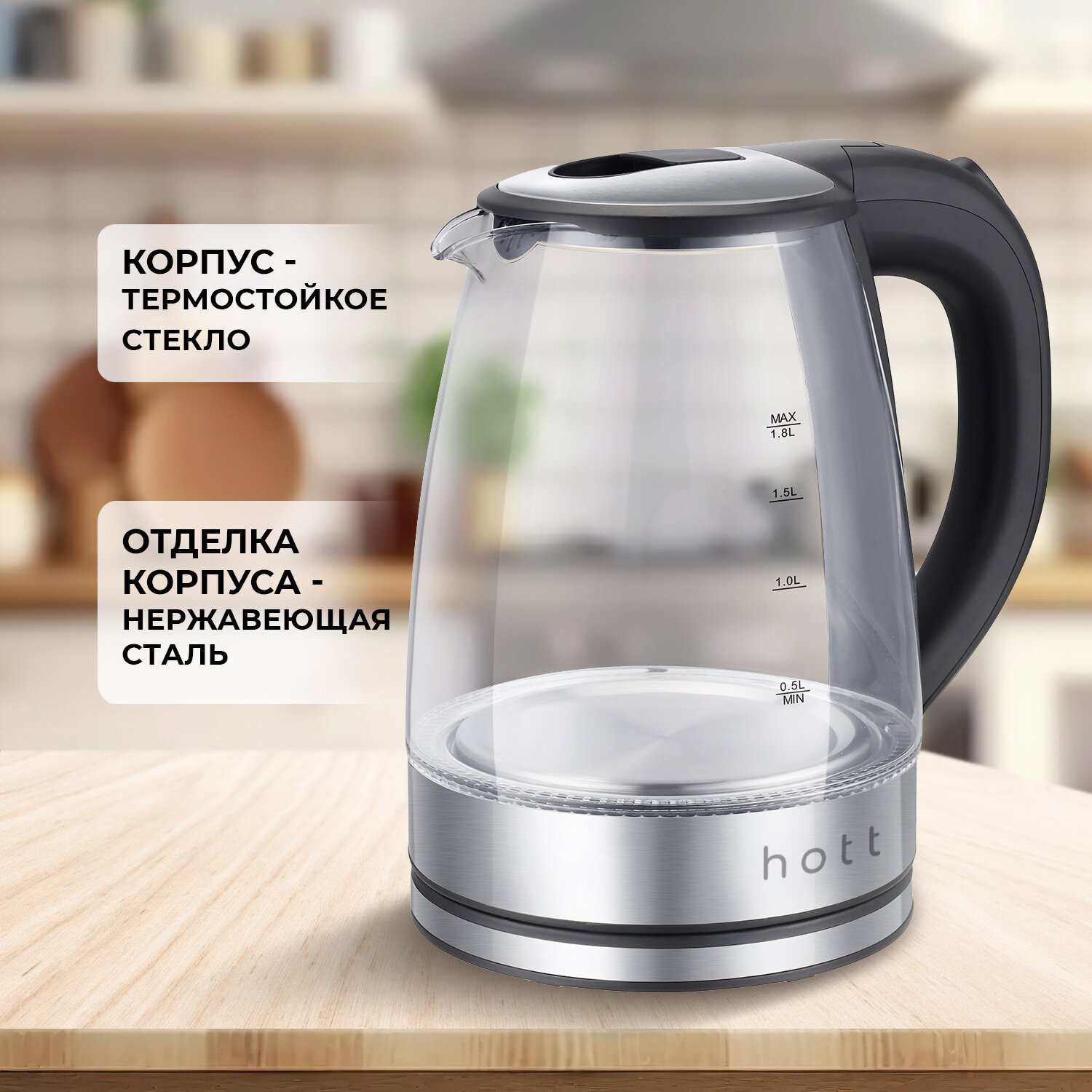 Купить Чайник электрический (электронный) стеклянный с подсветкой Hott HT-EKG05. Прозрачный электрочайник из жаропрочного стекла