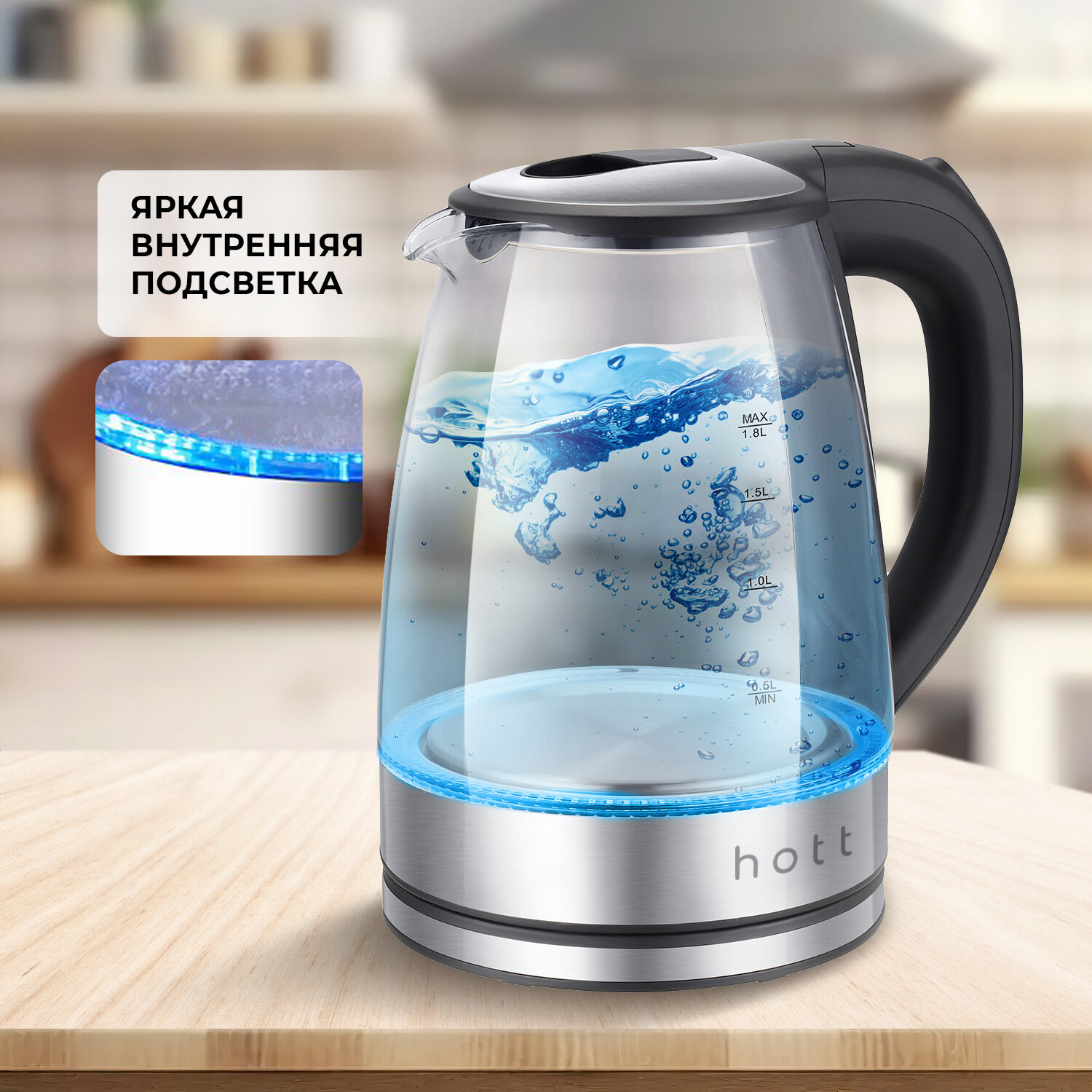 Чайник электрический (электронный) стеклянный с подсветкой Hott HT-EKG05. Прозрачный электрочайник из жаропрочного стекла интересное: