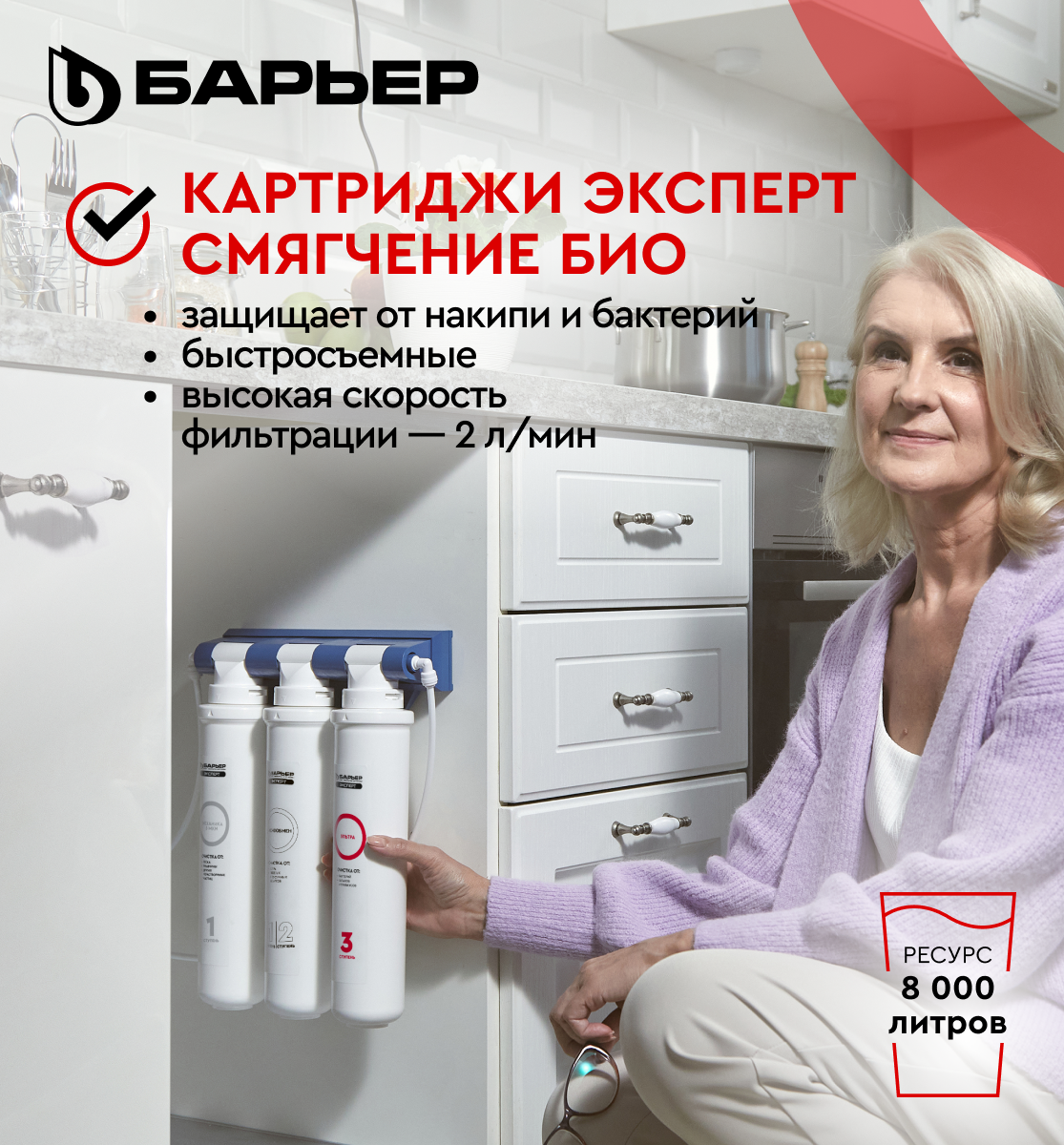 БАРЬЕР эксперт Смягчение БИО, комплект картриджей для фильтра под мойку, защищает от накипи и бактерий, быстросъемные