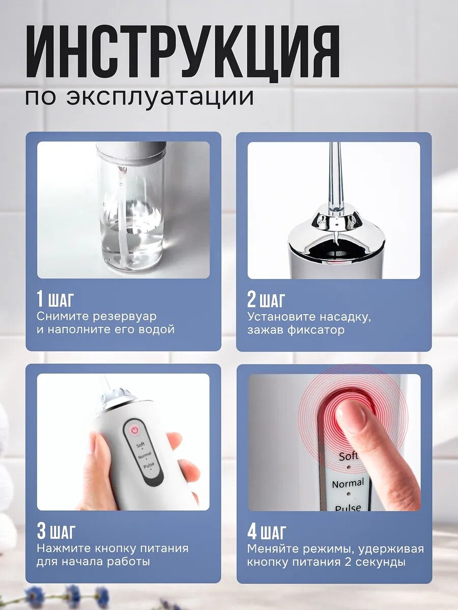 Купить Ирригатор для чистки полости рта и зубов портативный с комплектом насадок и кабелем USB/ белый