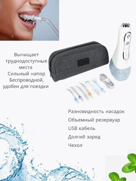 Ирригатор для полости рта портативный/для зубов, 6 сменных насадок, 5 режимов для чистки зубов и брекетов языка импульсивный ортодонтический/с чехлом интересное: