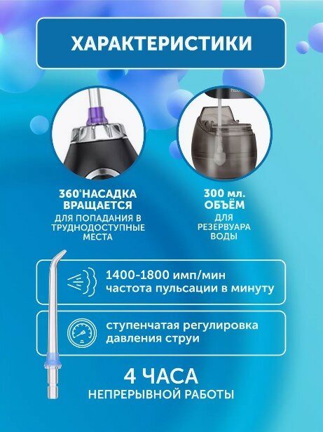 | Насадки | для струйной чистки / для чистки языка / ортодонтическая (для брекетов) / пародонтологическая (для десен) |