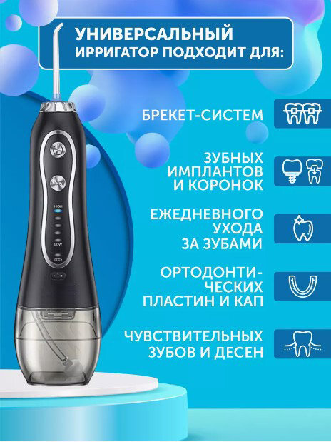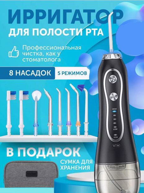 Ирригатор для полости рта портативный/для зубов, 8 сменных насадок, 5 режимов для чистки зубов и брекетов языка импульсивный ортодонтический/с чехлом интересное: