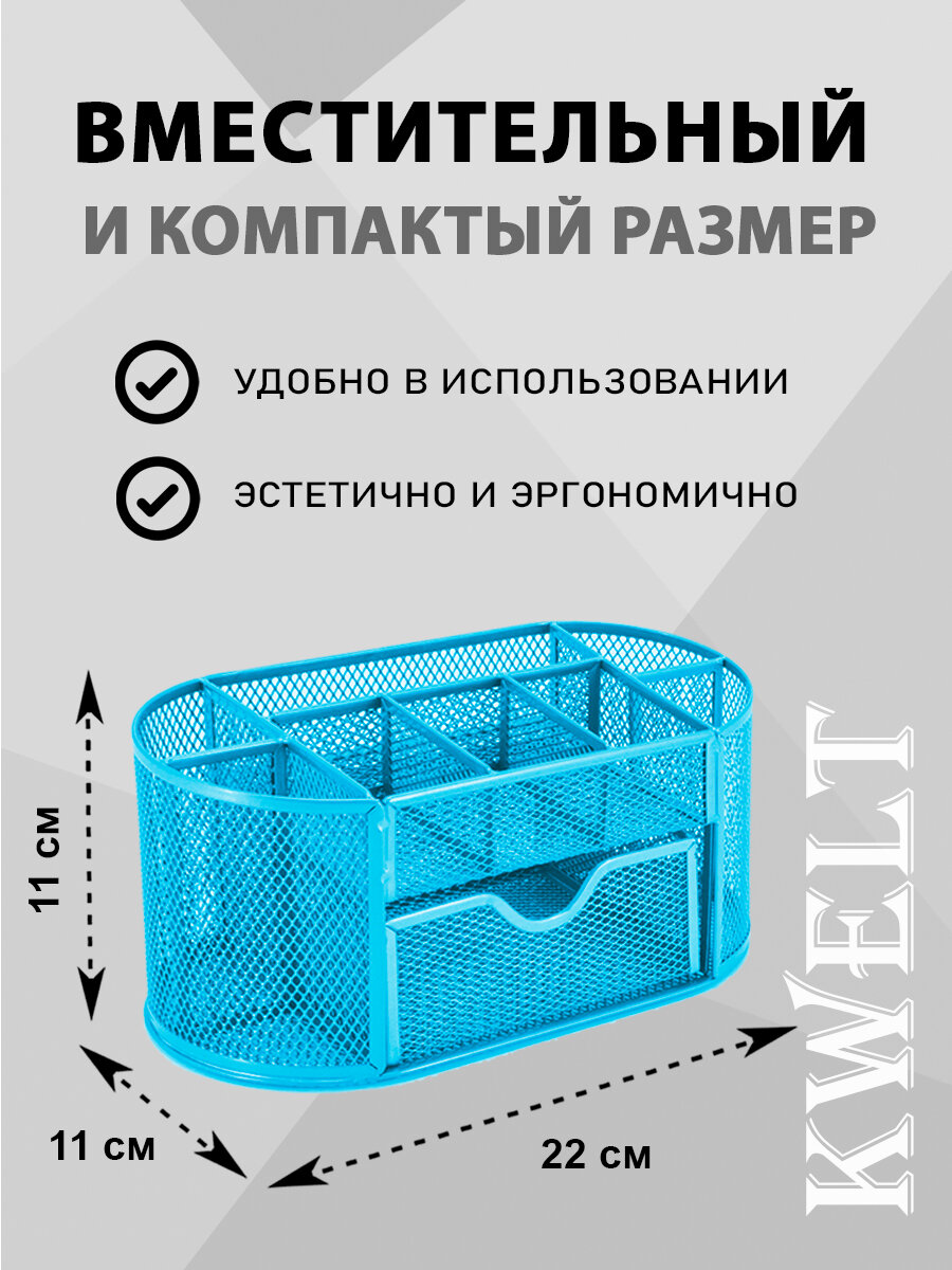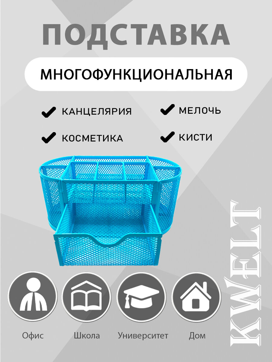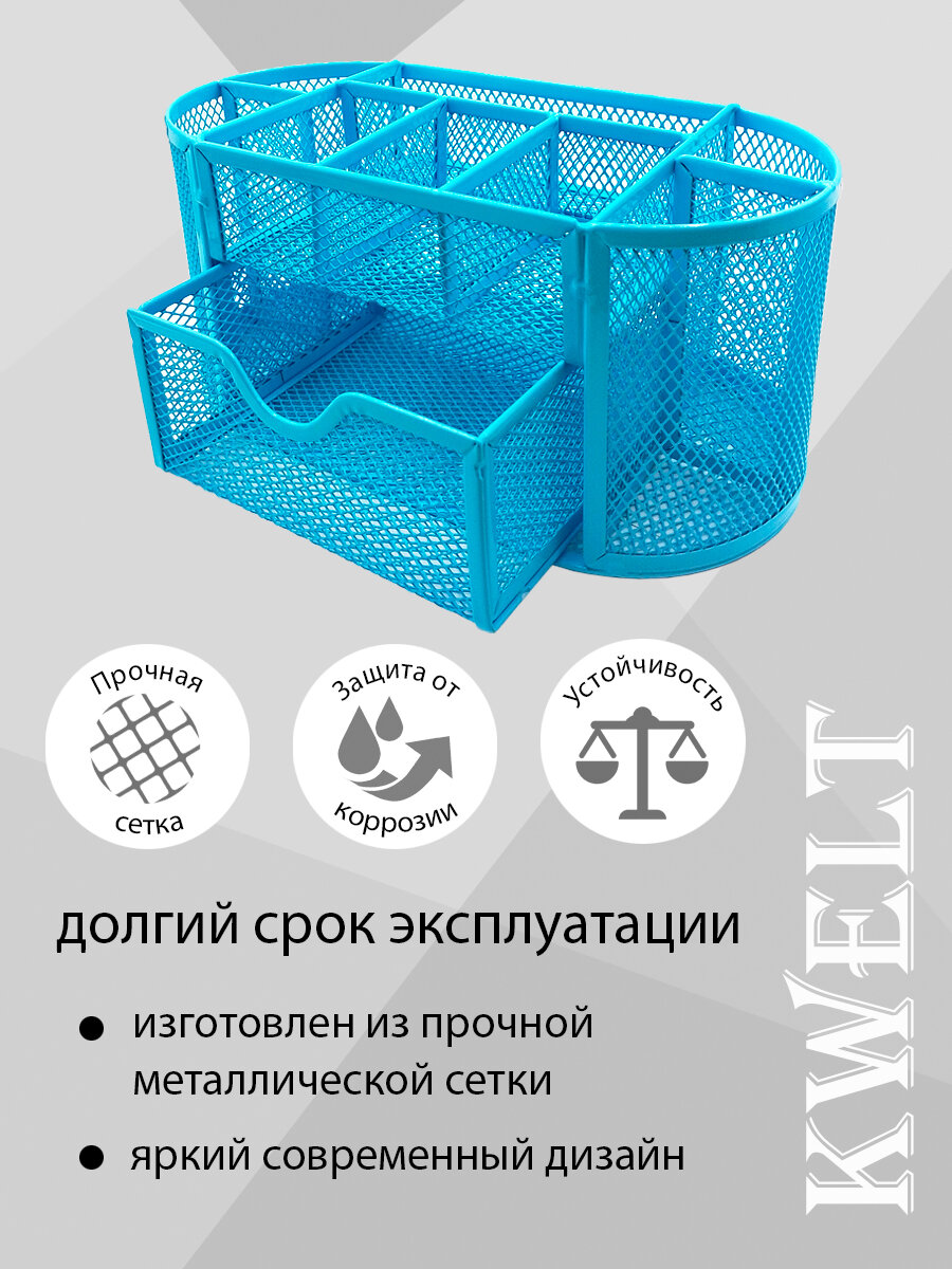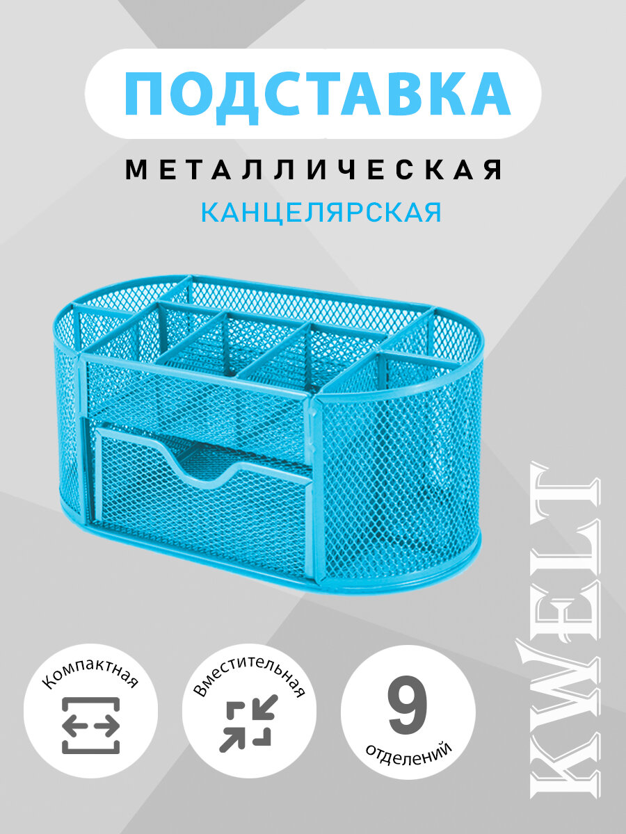 Купить Подставка " KWELT " 9 отделений (1 выдвижное), металлическая, сетчатая, голубая, картонная упаковка 22,5*11*11см