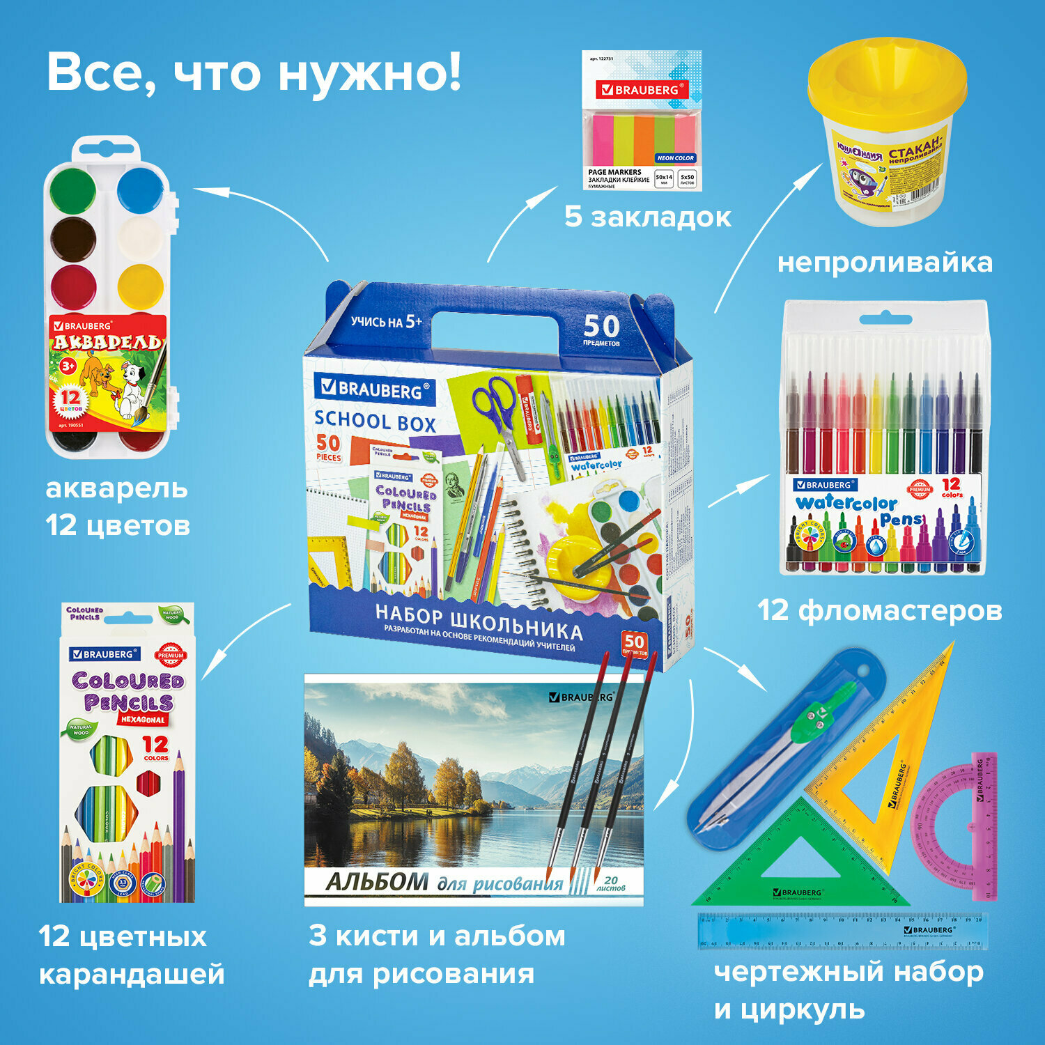 Набор первоклассника, школьника канцелярский в подарочной коробке Brauberg Школьный Универсальный, 50 предметов, Комплект 4 штуки, 880805 интересное: