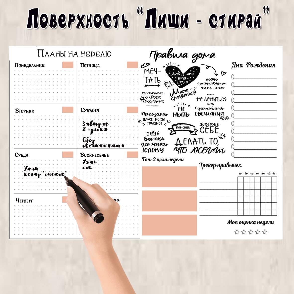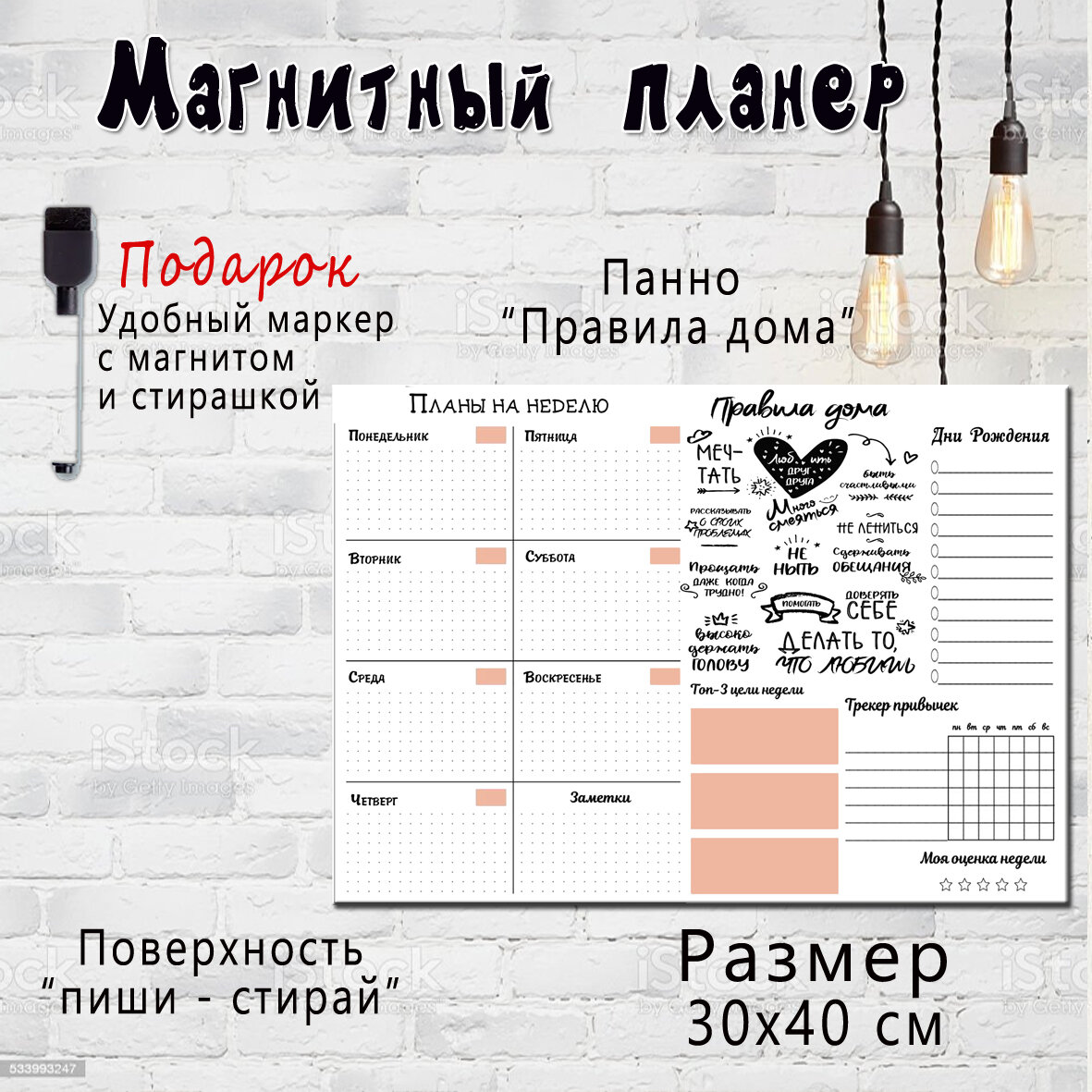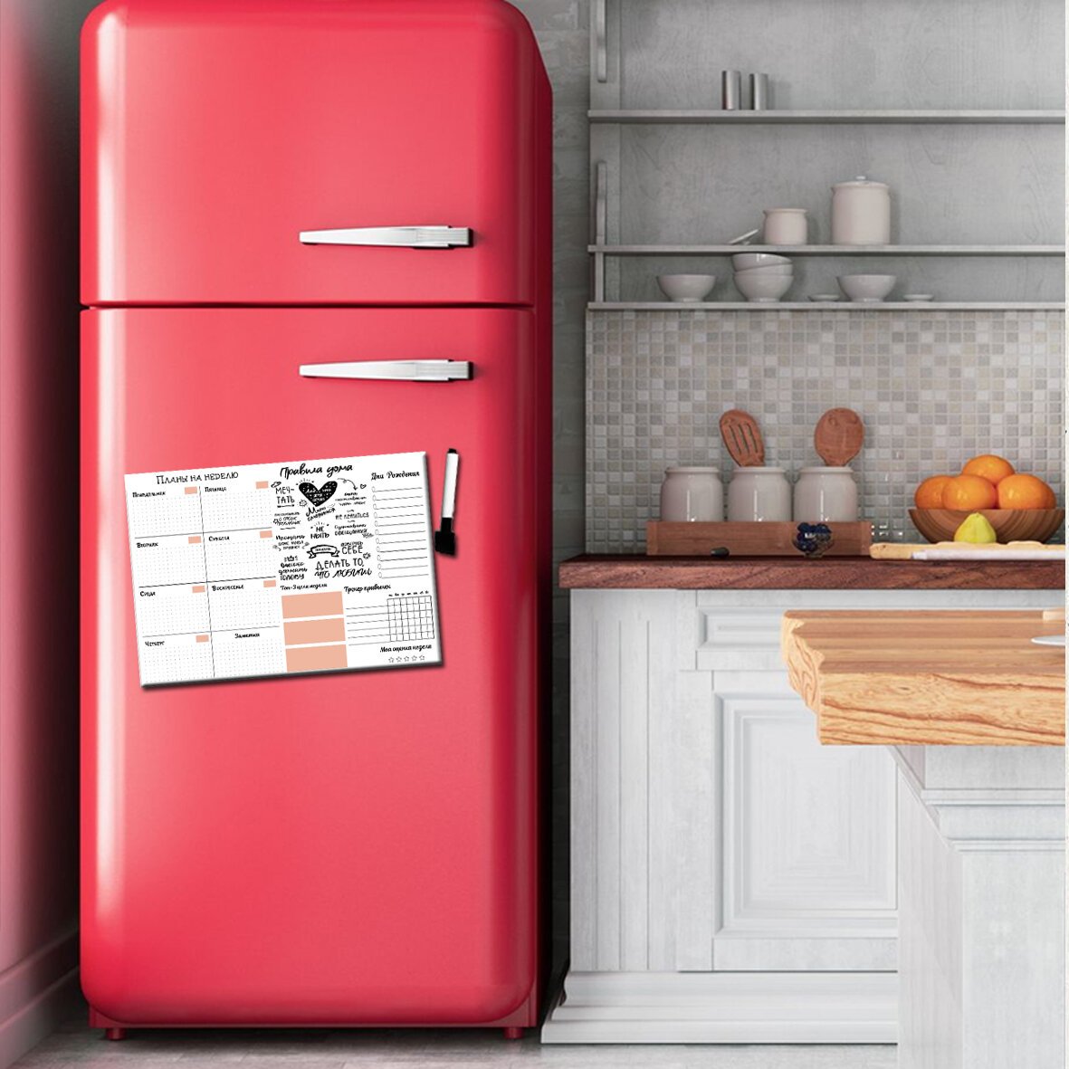 Магнитный планер - трекер на холодильник с панно "Правила дома" /поверхность "пиши-стирай" /30х40 см /семейный подарок интересное: