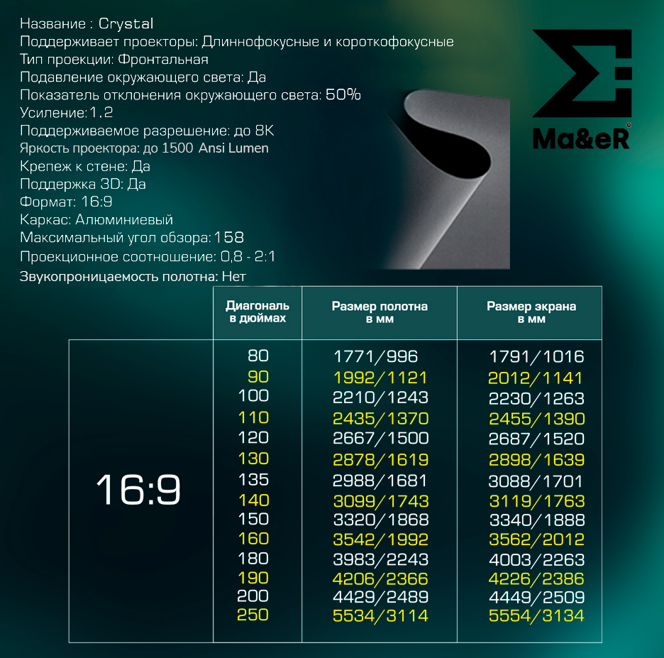 Купить Crystal 100" 16:9 Экран для длиннофокусных и короткофокусных проекторов