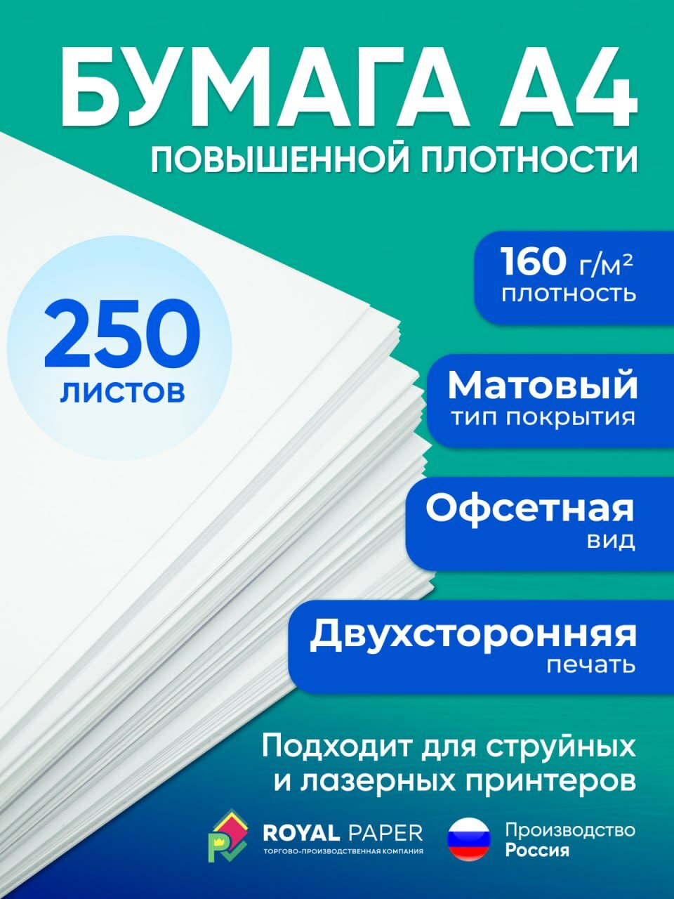 Купить Бумага А4 плотная 160 г/м2, 250 листов, двухсторонняя, офсетная (подходит для печати на струйном и лазерном принтере)