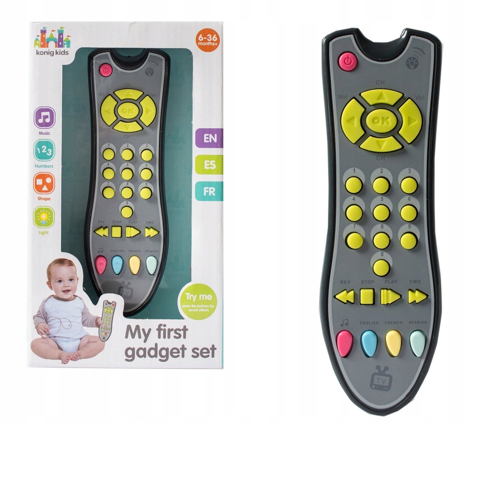 Купить Интерактивная игрушка детский музыкальный пульт от телевизора развивающий и обучающий, иностранный язык, цифры, фигуры для девочек и мальчиков 5,5х2,5х18 см.,63533
