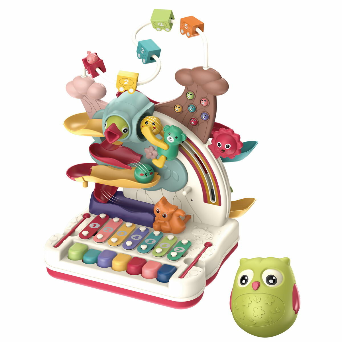| Комплектация | игрушка серпантин, шарики (2шт.), неваляшка сова, магнитные червячки 6 шт., машинка для трека, пианино, ксилофон |