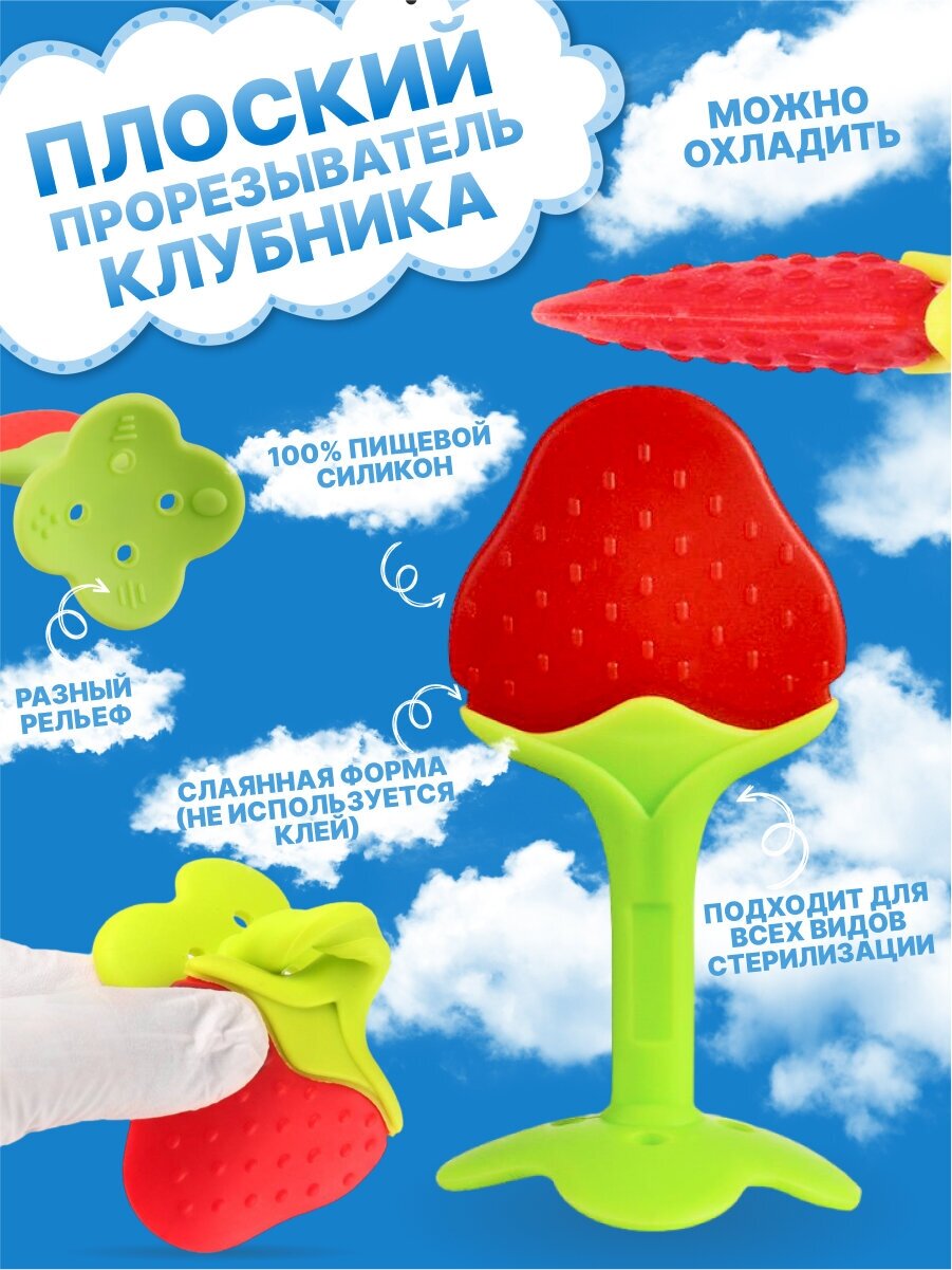 | Дополнительная информация | Набор прорезывателей для зубов в пластиковом контейнере (футляре) 5 предметов; прорезыватель с охлаждающим эффектом клубника, прорезыватель банан щетка для зубов; грызунок с ограничителем; термо ложка и ниблер детский с 2 сосками сеточками для прикорма малышей |