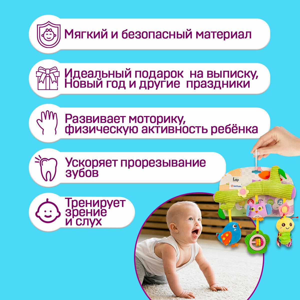 | Развивающие элементы | пищалка, погремушка, прорезыватель, тактильные вставки, шуршащие и хрустящие элементы |
