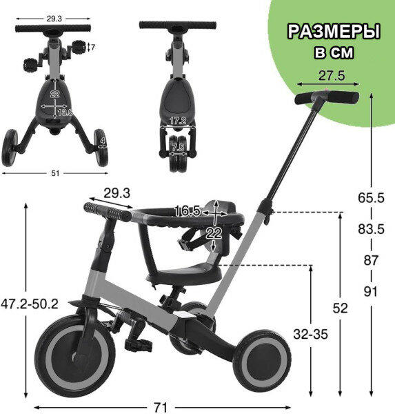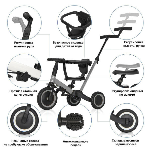 Детский беговел-велосипед 6-в-1 с родительской ручкой, серый интересное: