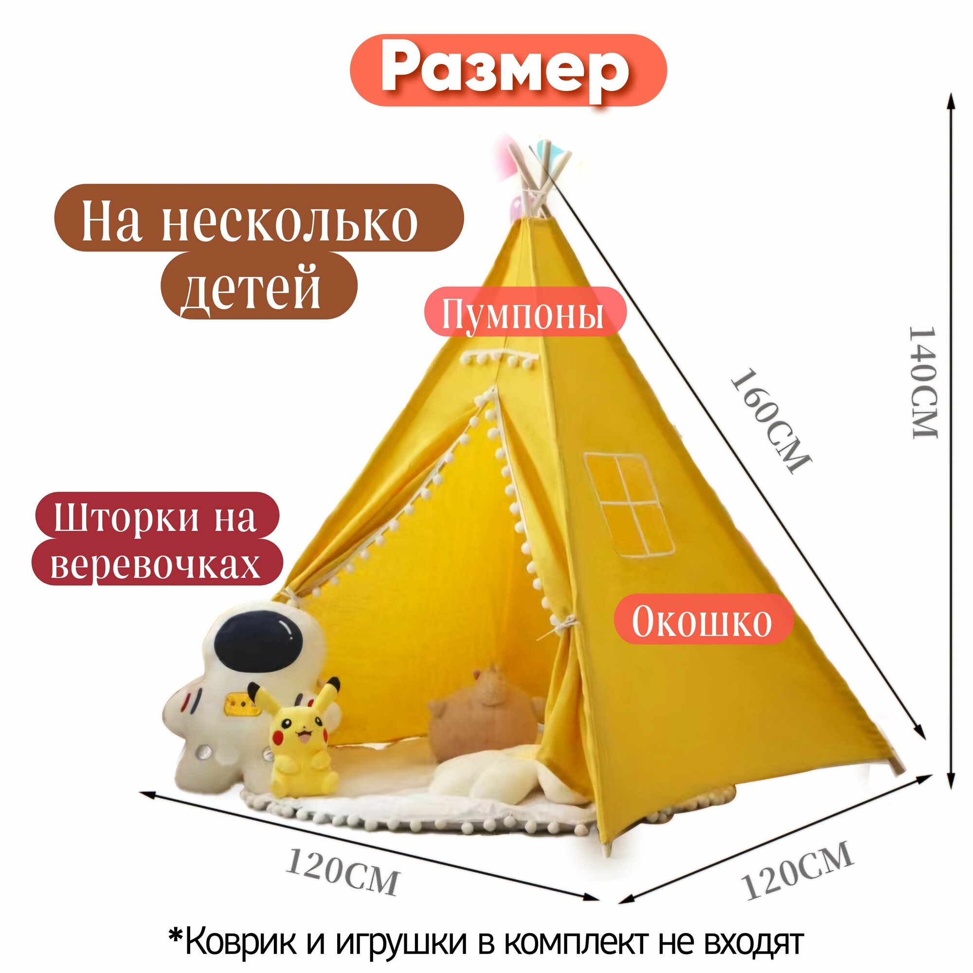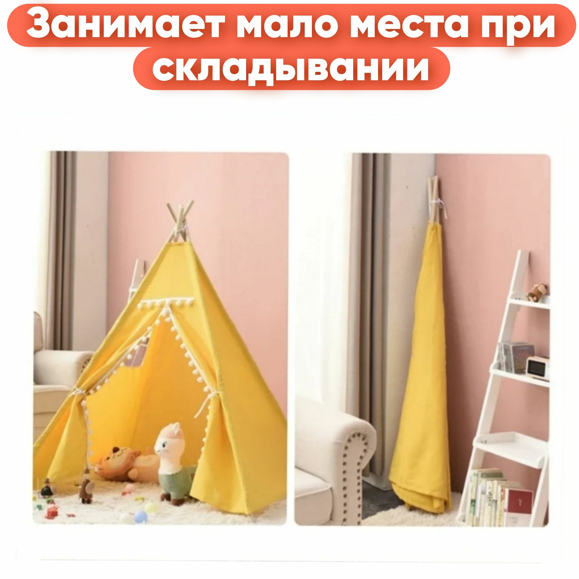 Виг-вам детский с окошком и пумпонами желтый - Палатка детская в индийском стиле без пола интересное: