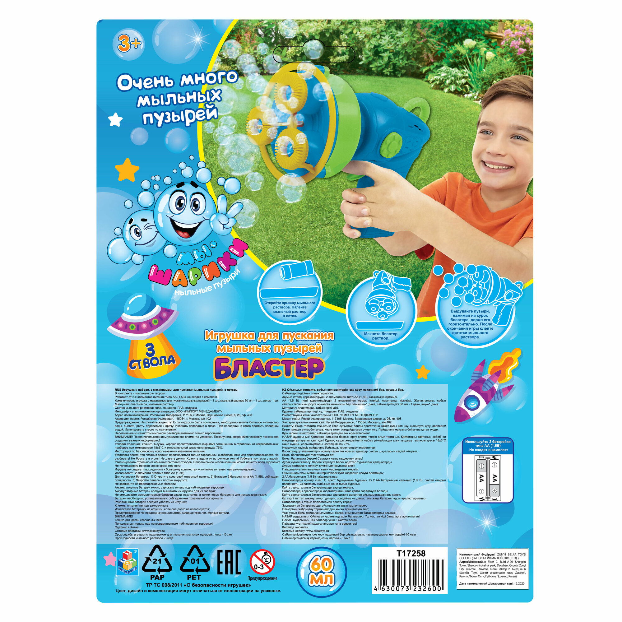 | Дополнительная информация | комплектация: игрушка для пускания мыльных пузырей, мыльный раствор, лоток для мыльного раствора |