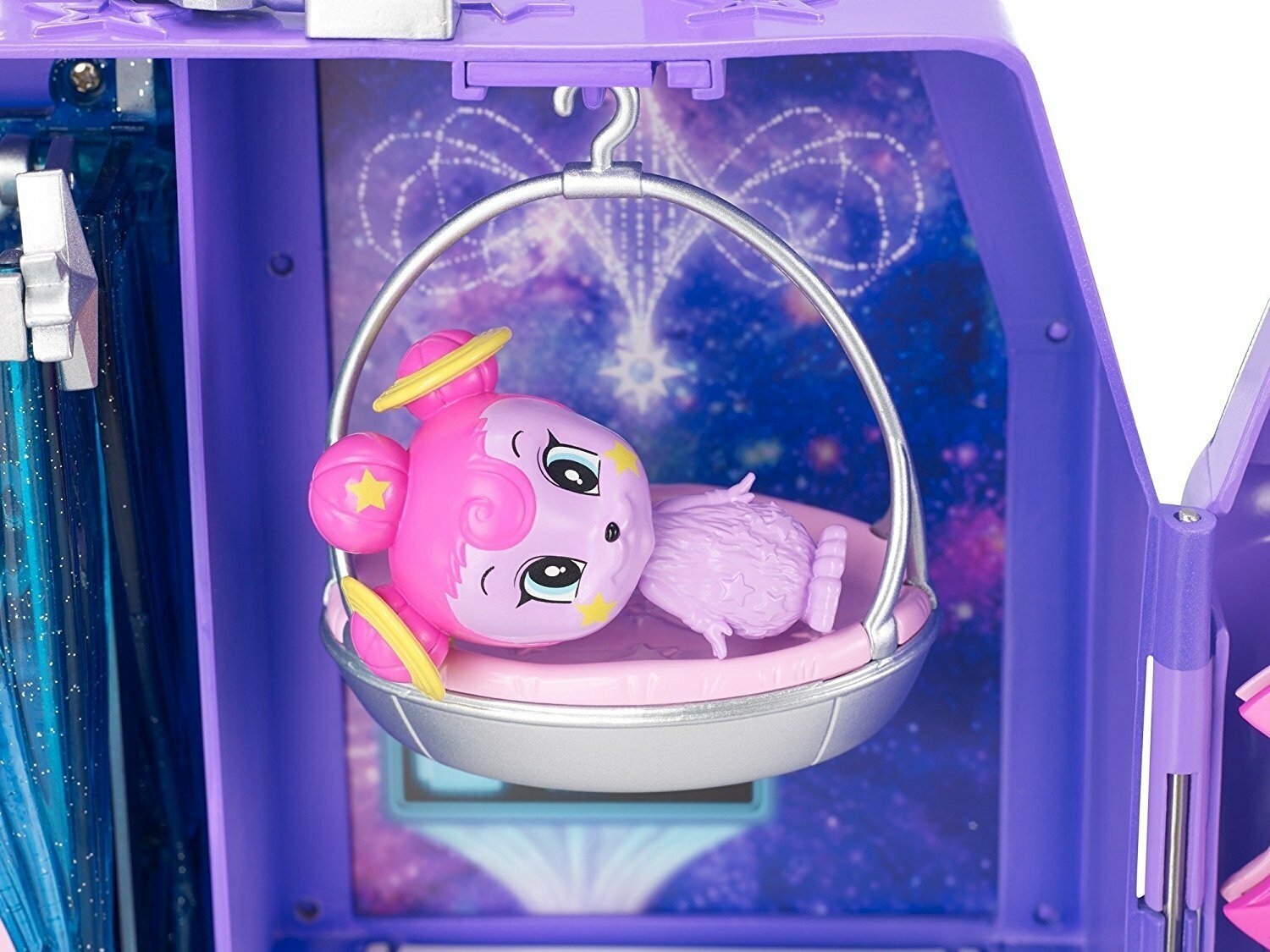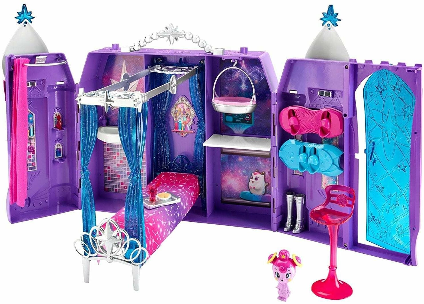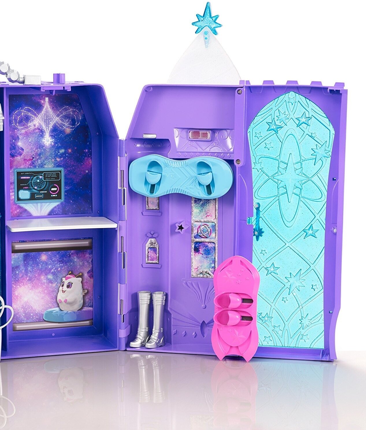 | Подробная комплектация | складной набор «Космический замок» с ручкой, два ховерборда, фиолетовый питомец, гамак для питомца, диван-канапе с мягким одеялом, занавеска для душа, тематические аксессуары |