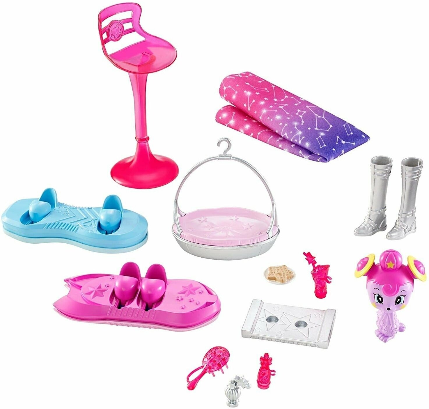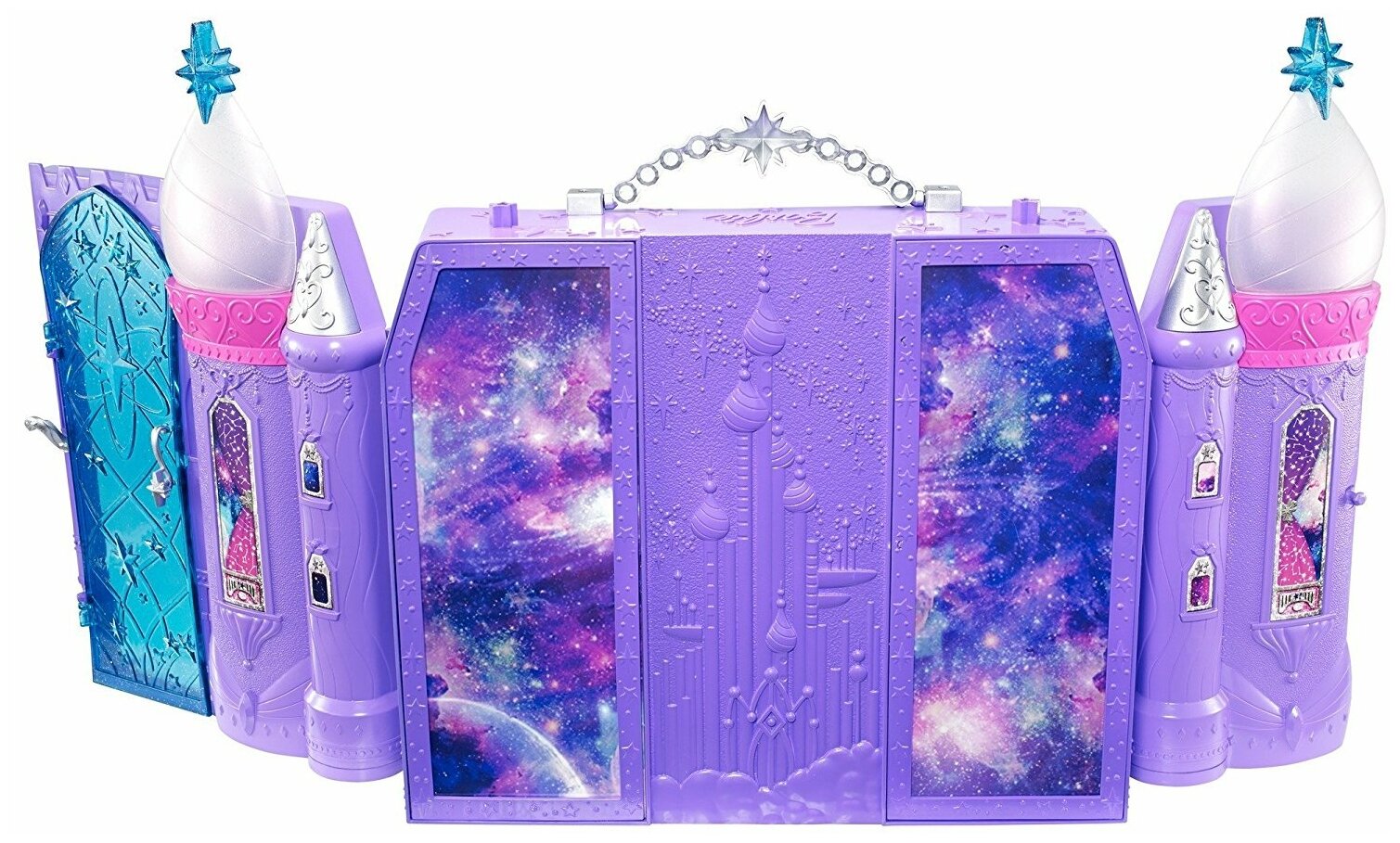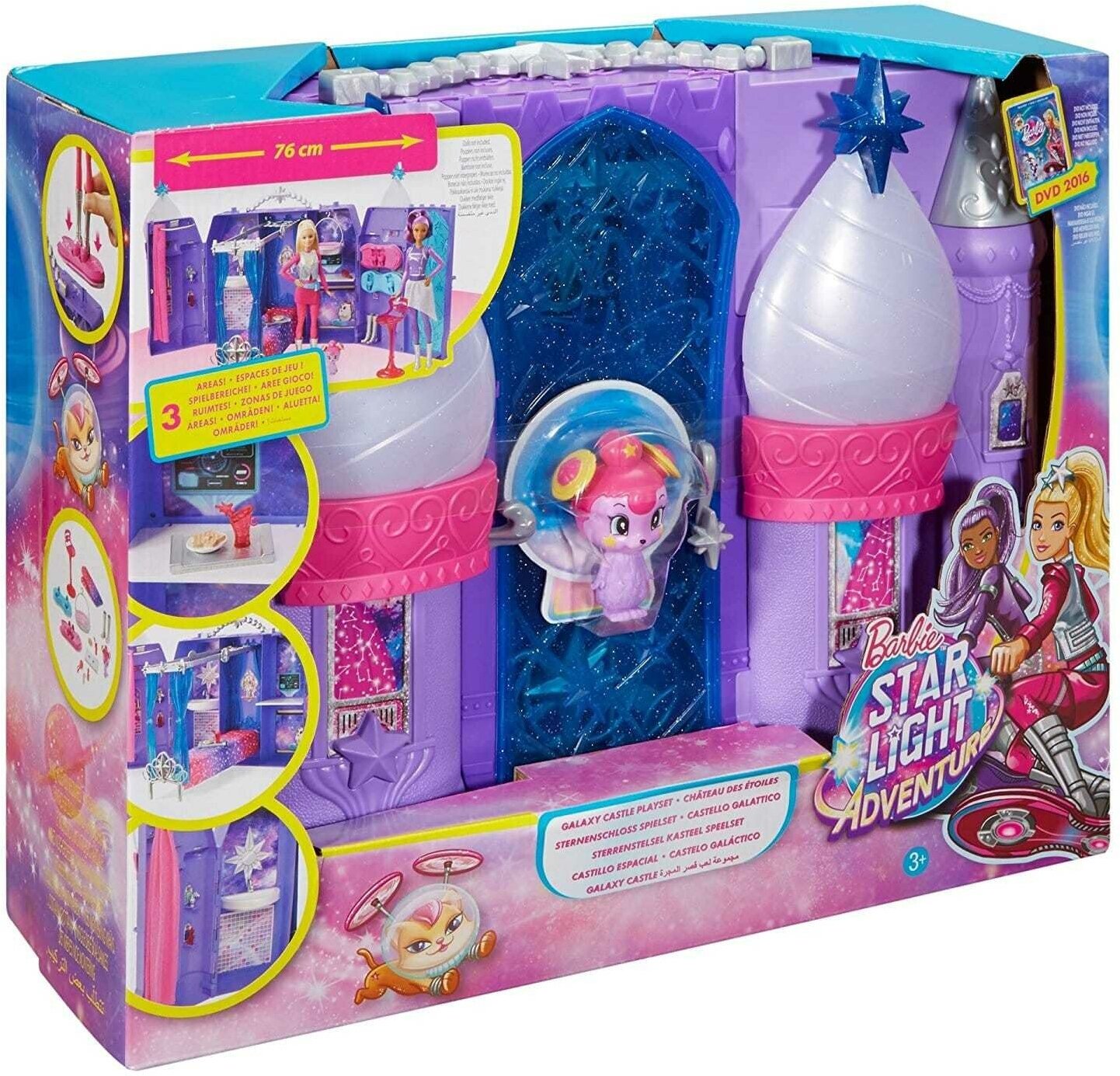 | Подробная комплектация | складной набор «Космический замок» с ручкой, два ховерборда, фиолетовый питомец, гамак для питомца, диван-канапе с мягким одеялом, занавеска для душа, тематические аксессуары |