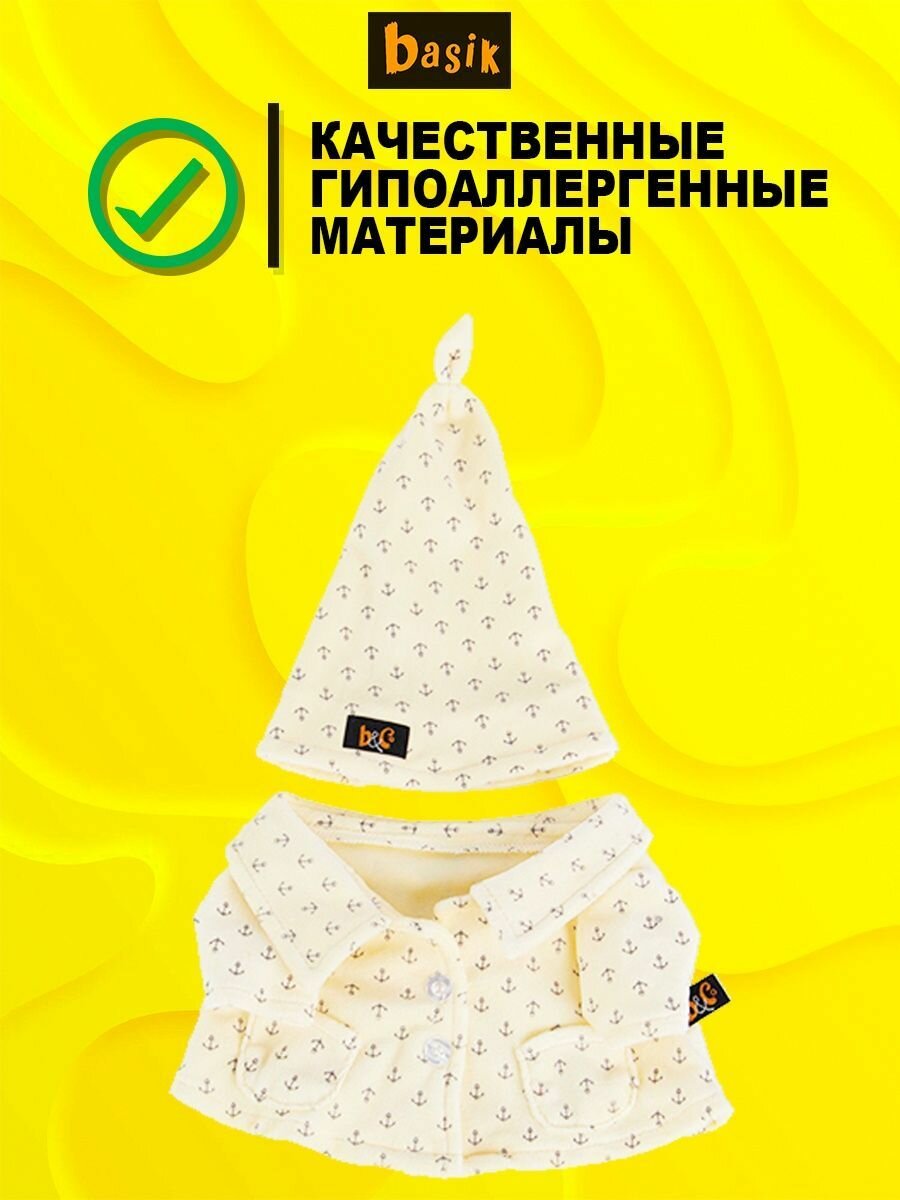 | Дополнительная информация | Басик в милой тёплой пижамке цвета топлёного молока из мягкого хлопка-интерлока с принтом в виде якорьков на двух пуговичках с колпачком той же расцветки и логотипом B&C; ножки не зафиксированы и выпрямляются сами; вся одежда снимается; упаковка - подарочная коробка с бантом, размеры упаковки: 26 х 16 х 13 см |