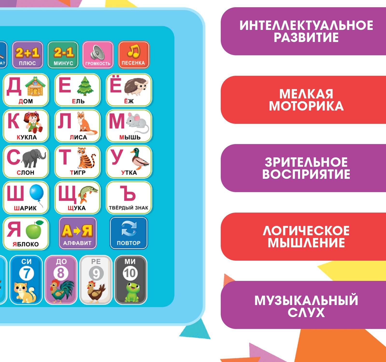 | Развиваемые навыки | бытовые и социальные навыки, изучение цветов, логика и мышление, моторика и ловкость, память и внимание, речь и чтение, словарный запас, счет и математика, творческое мышление, эрудиция |