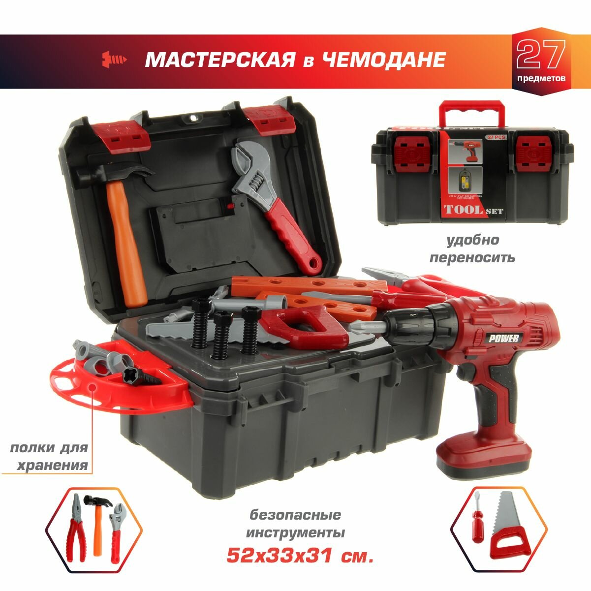 Детский игровой набор инструментов для мальчиков, 27 предметов, Veld Co / Шуроповерт на батарейках с насадками для детей интересное: