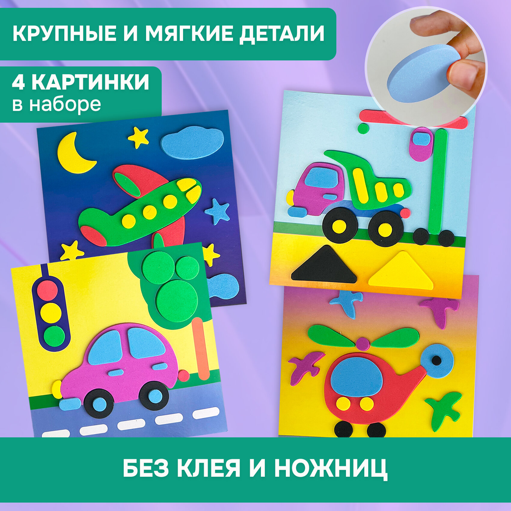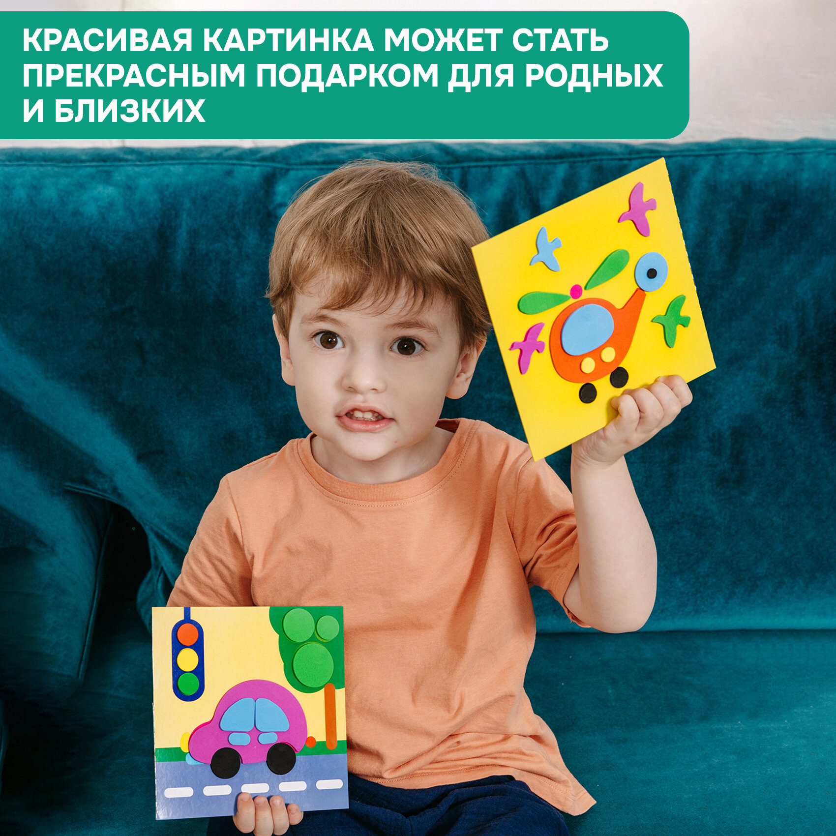 | Комплектация | В наборе: 4 цветные основы с рисунком-схемой, детали из ЭВА на самоклеящейся основе (6 цветов), декоративные элементы на самоклеящейся основе (глазки), цветная листовка-образец |