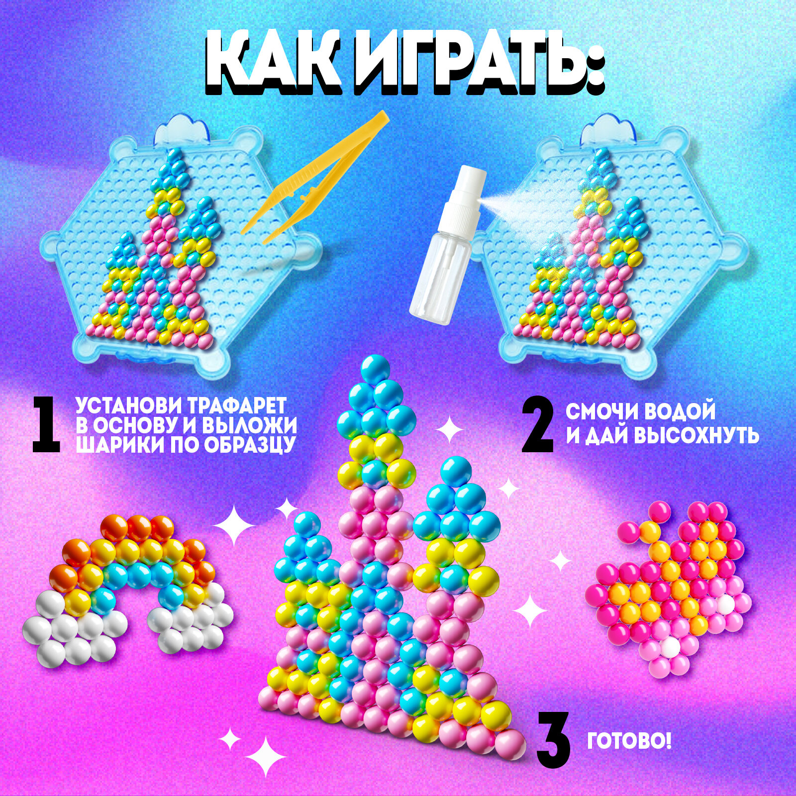 | Комплектация | Основа для аквамозайки. Цветной бисер. Баночка-распылитель для воды. |