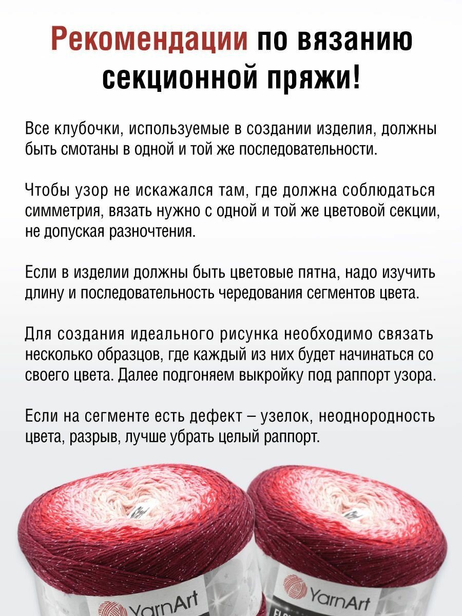 СохранитьПряжа для вязания YarnArt 'Flowers Moonlight', 260г, 1000м (53% хлопок, 43% полиакрил, 4% металлик) (3269 секционный), 2 мотка интересное:
