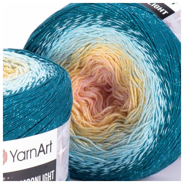 Пряжа YarnArt Flowers Moonlight морская волна-св.голубой-св.желтый-корал (3270), 53%хлопок/43%акрил/4%металлик, 1000м, 260г, 1шт
