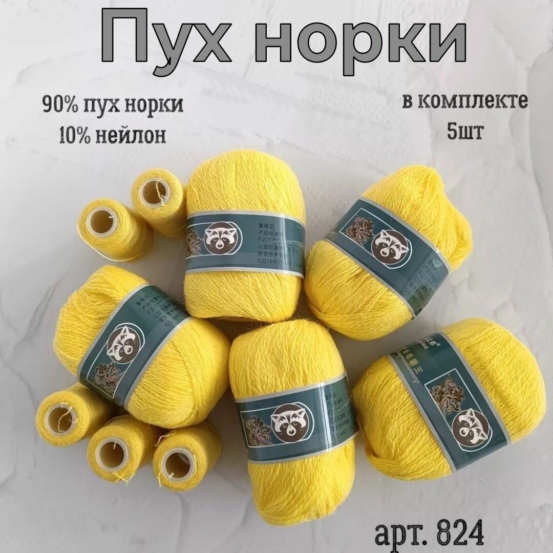 Купить Пряжа Пух норки - 5 мотков 50гр/350м + 5 мотков добавочной нити, цвет 824 жёлтый, синяя этикетка