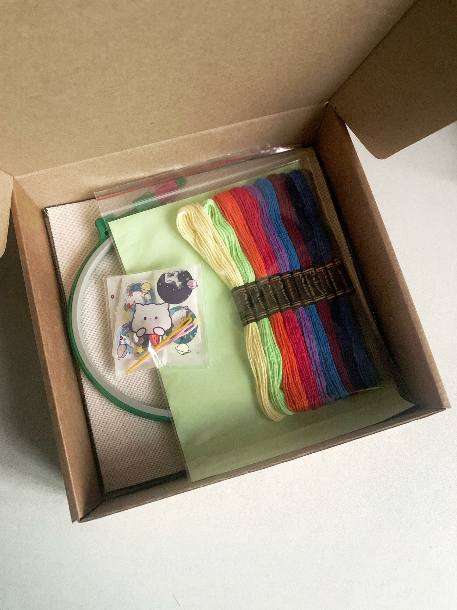 | Комплектация | Картонная коробка 20*20*6см; 5 рисунков на канве 20*20см; Пяльцы пластиковые диаметр 16см; Инструкция по вышивке; 10 ниток мулине 100% хлопок длиной по 8м; Иголки пластиковые 5см - 2шт; Иголка металлическая 3,6см - 1шт; Нитевдеватель - 1шт; Подарок - 1шт |