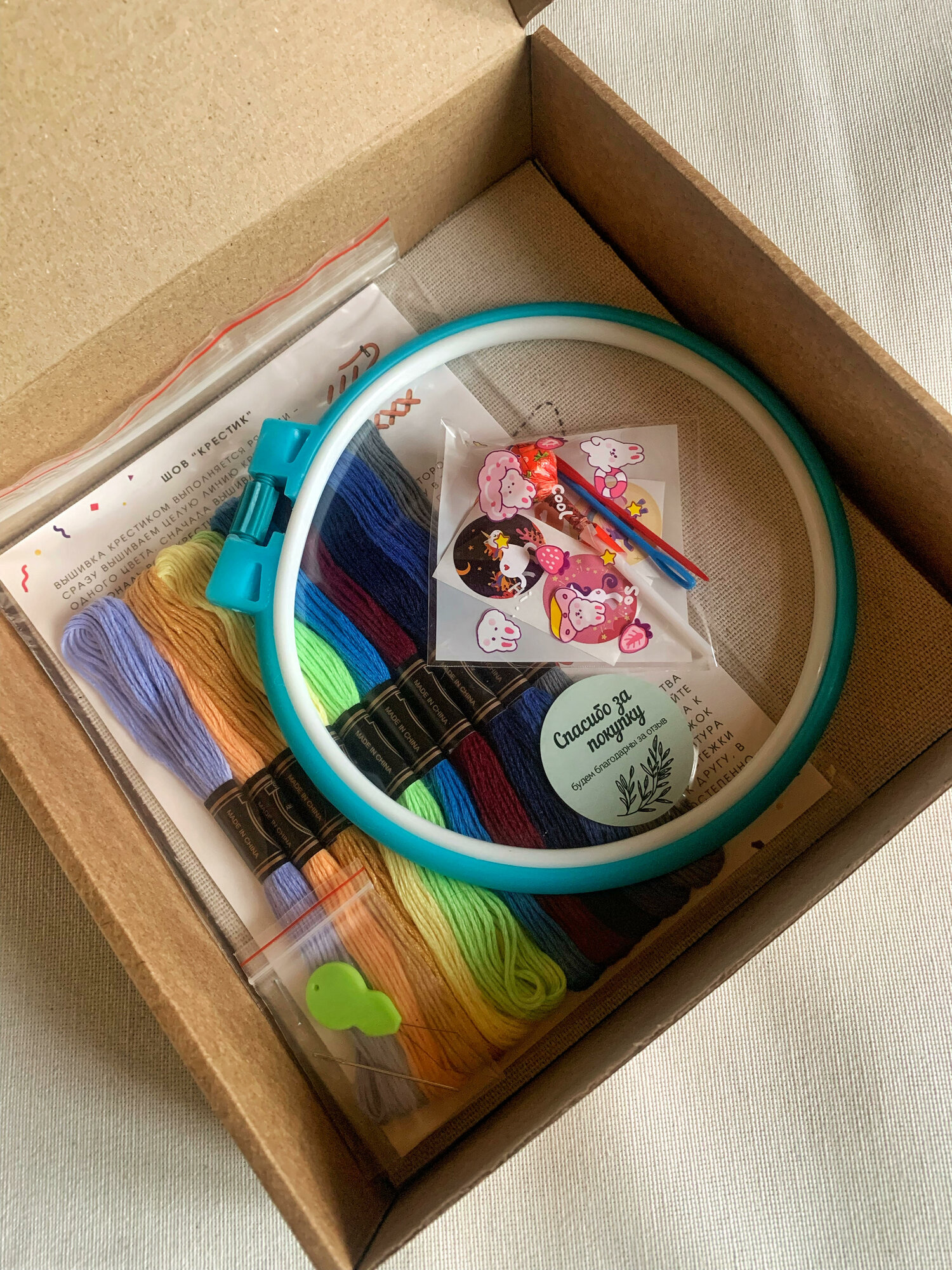 | Комплектация | Картонная коробка 20*20*6см; 5 рисунков на канве 20*20см; Пяльцы пластиковые диаметр 16см; Инструкция по вышивке; 10 ниток мулине 100% хлопок длиной по 8м; Иголки пластиковые 5см - 2шт; Иголка металлическая 3,6см - 1шт; Нитевдеватель - 1шт; Подарок - 1шт |