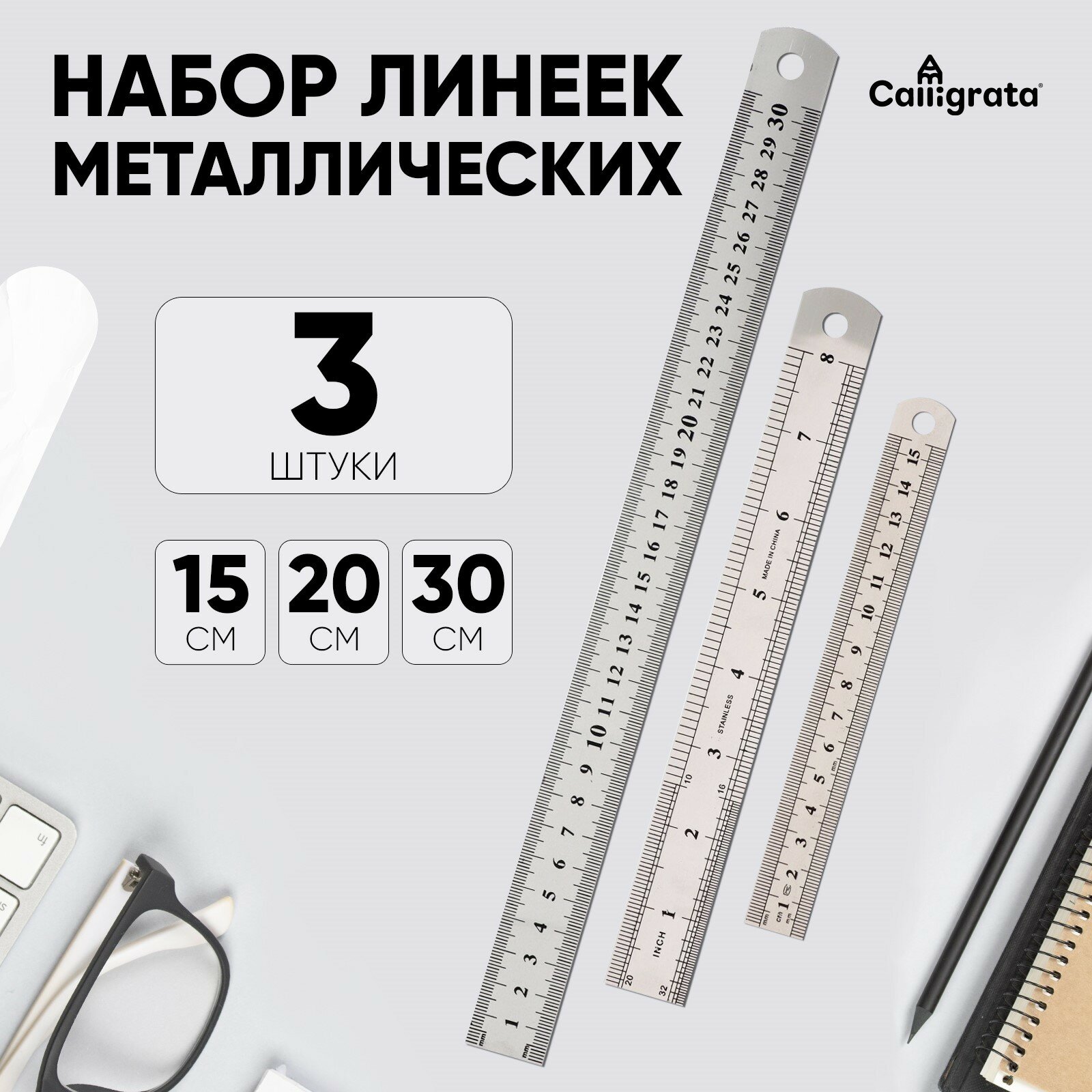 Набор линеек металлических 3 штуки: 15 см, 20 см, 30 см.