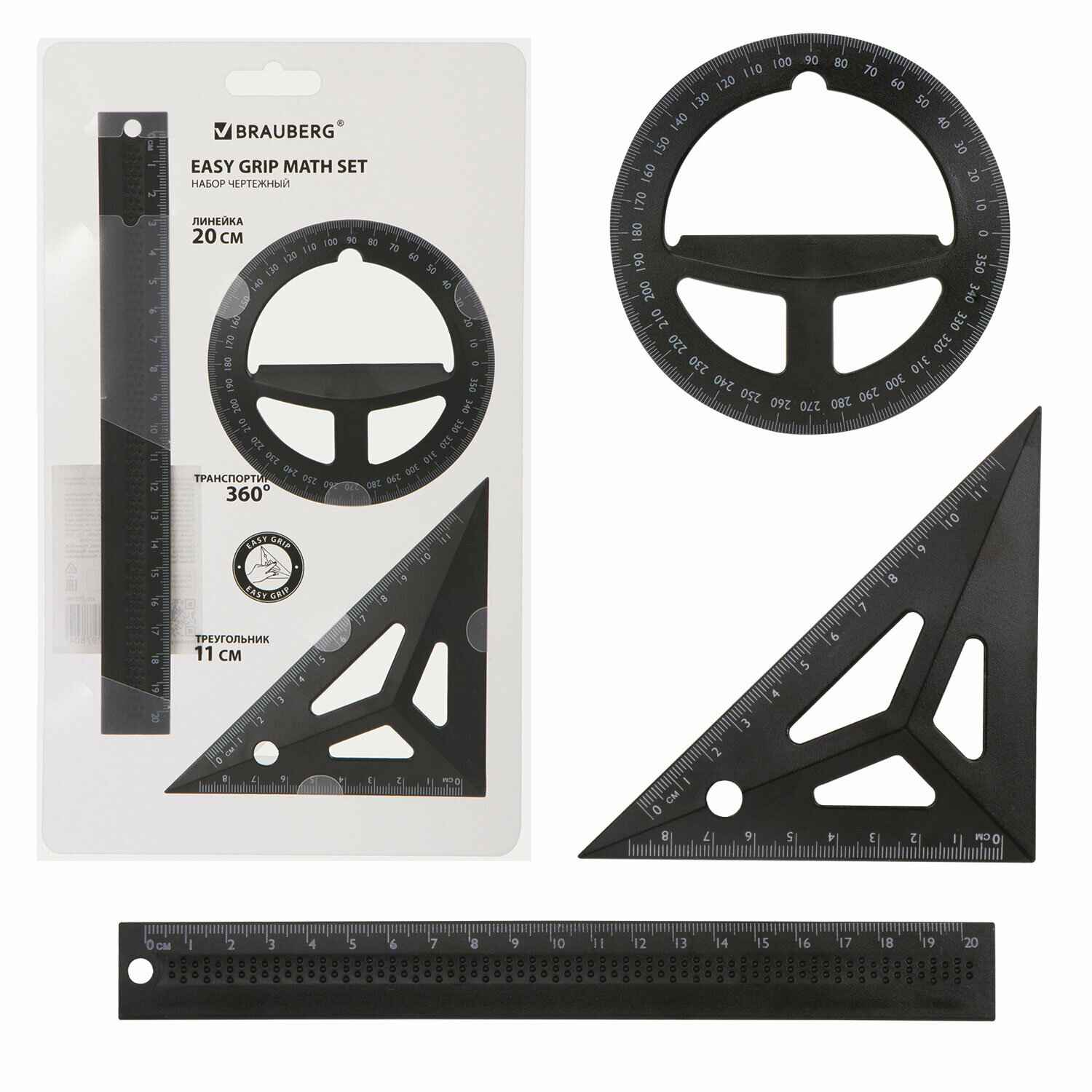 Купить набор чертежный BRAUBERG объёмный линейка 20см угольник транспортир черный подвес