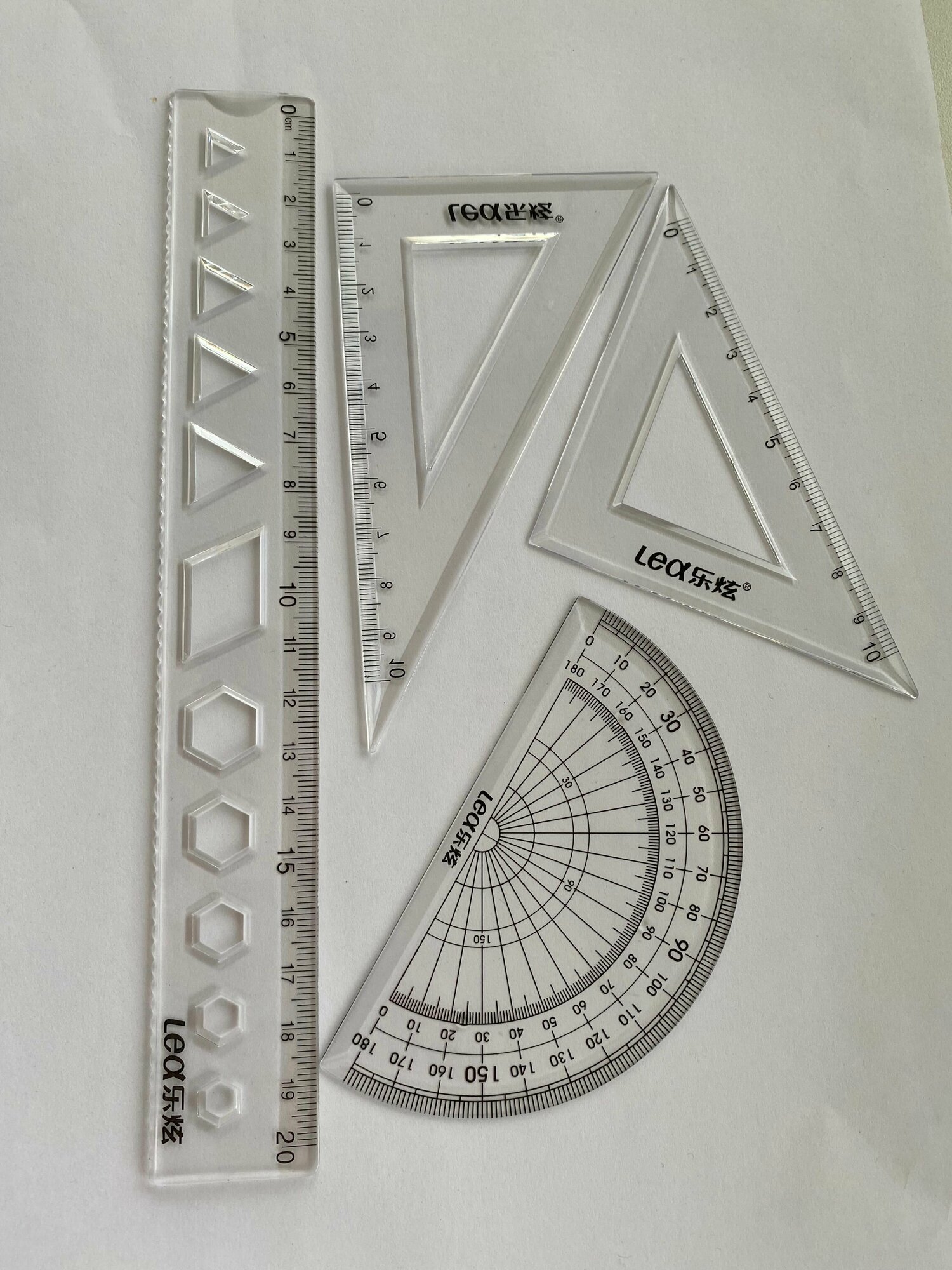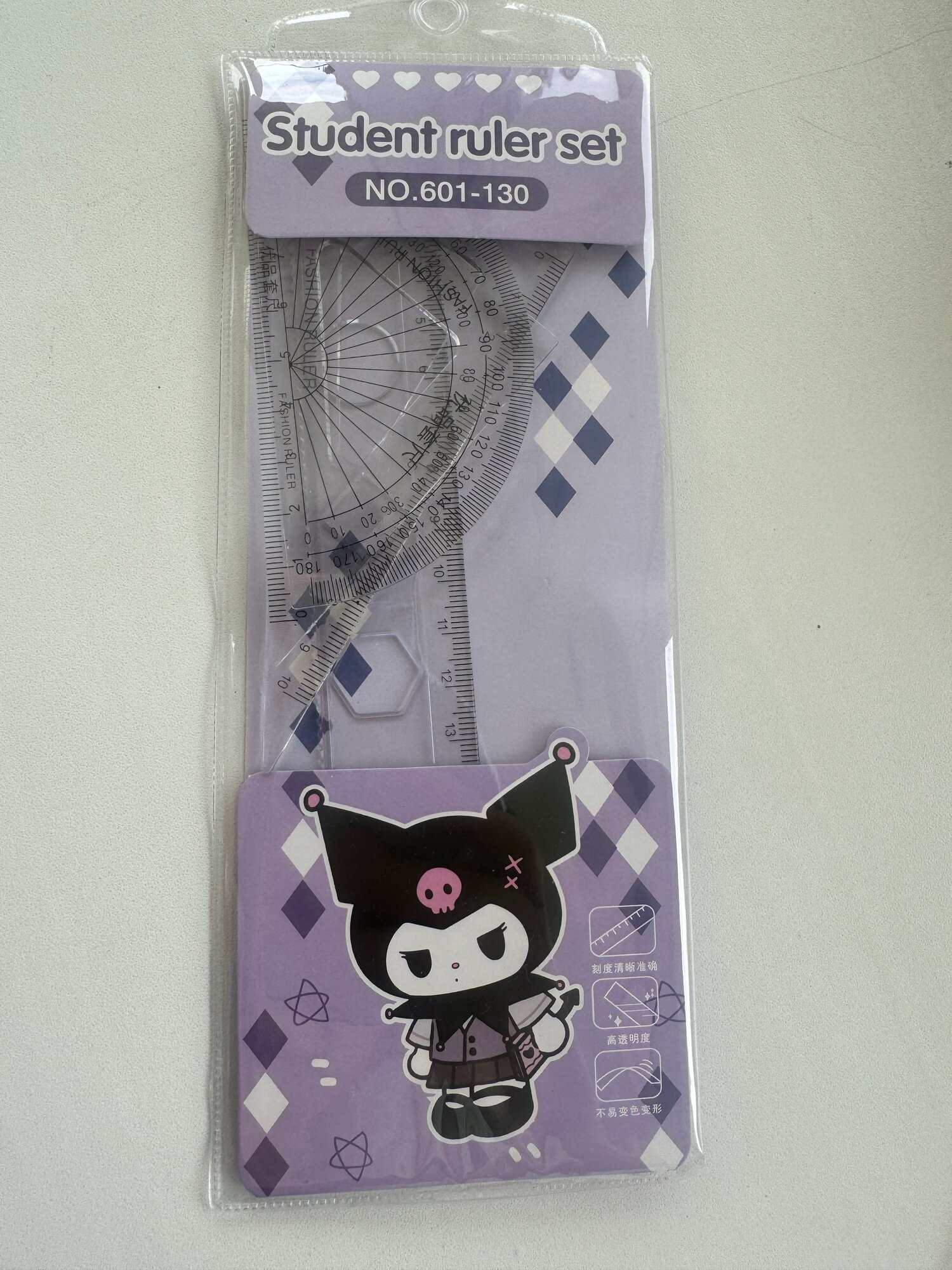 | Комплектация | линейка; транспортир; два угольника в пластиковом конверте на кнопке |