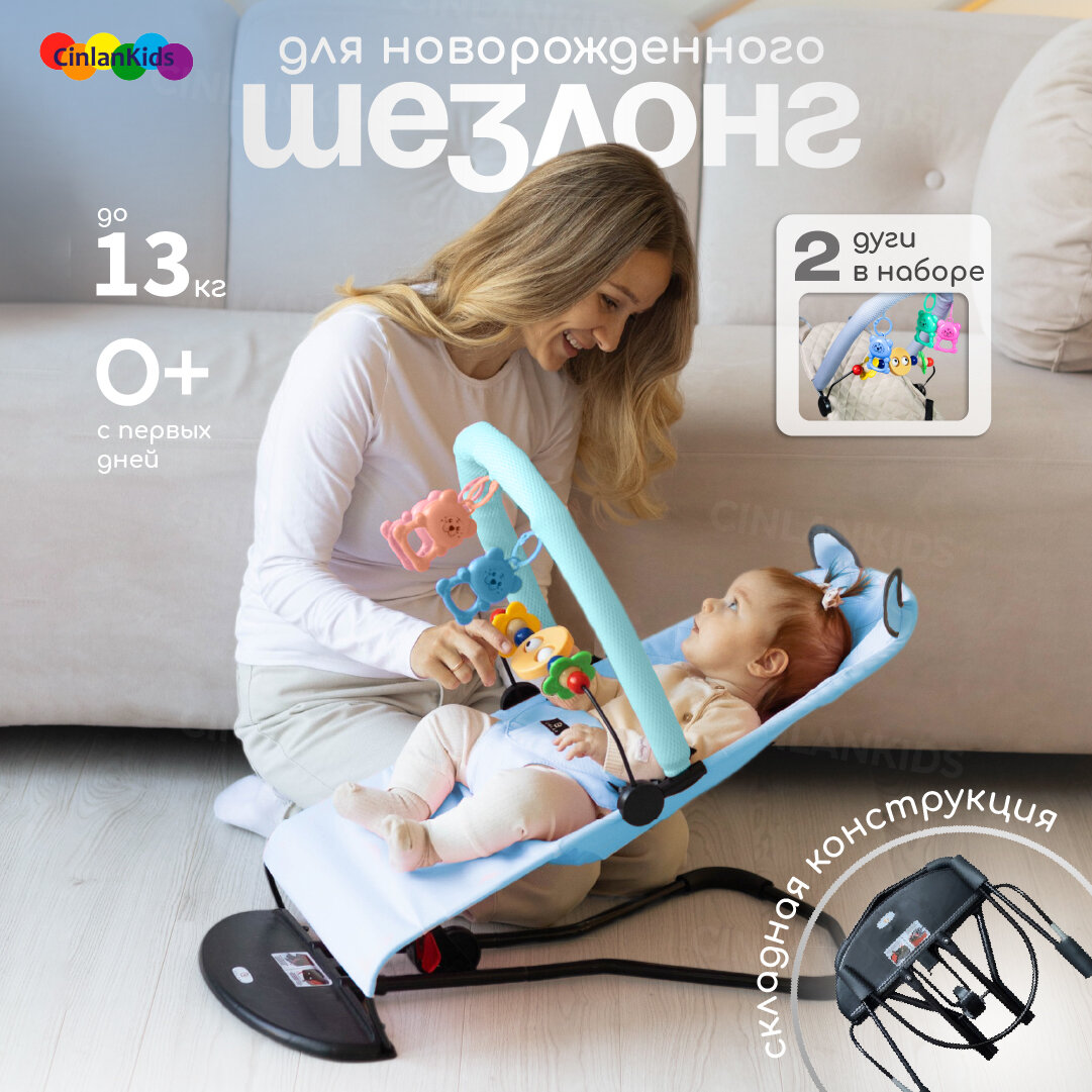 Кресло шезлонг детский для новорожденных с игрушкой дугой, синий, CINLANKIDS интересное: