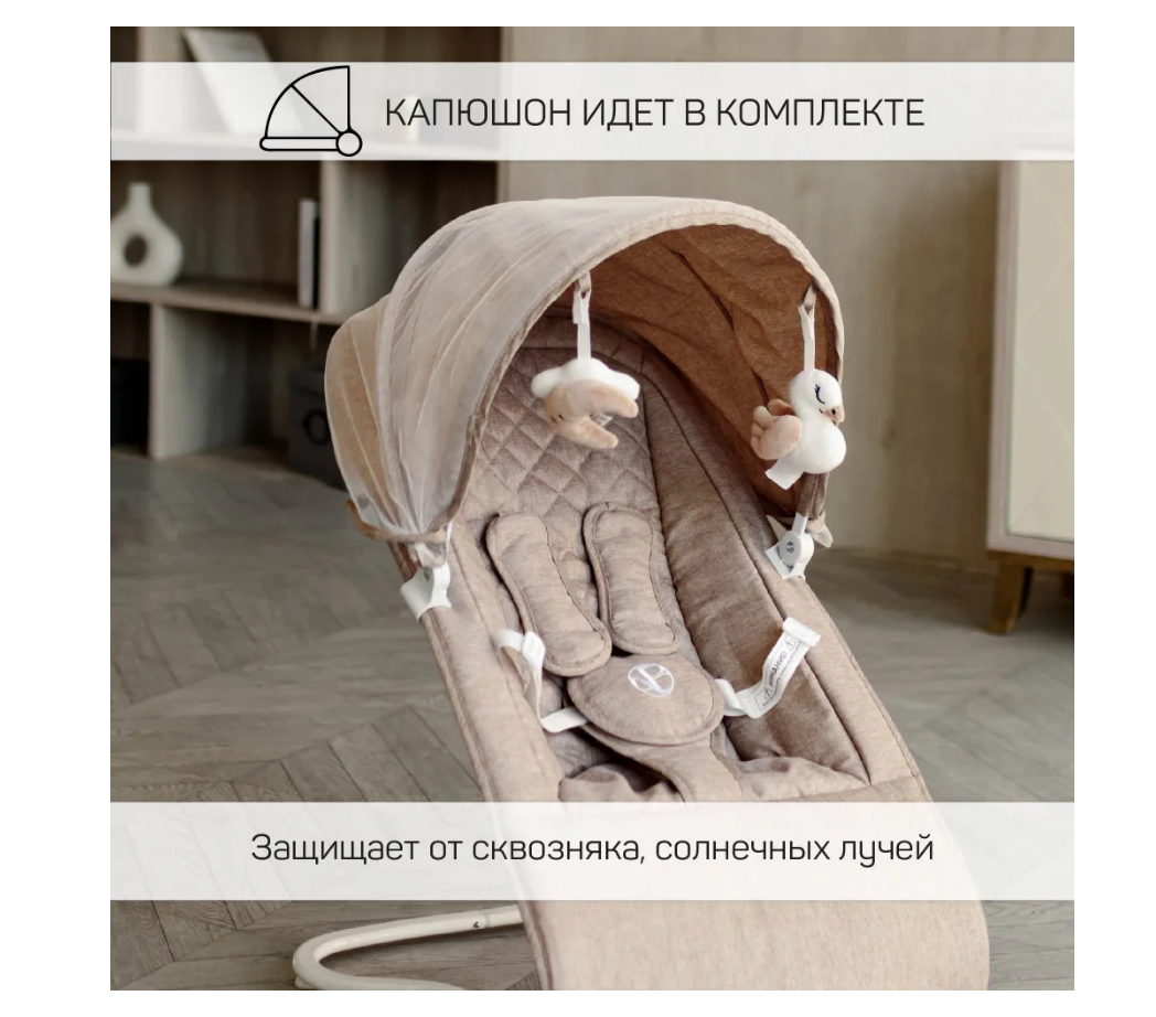 | Комплектация | основой блок, трубка для сиденья, трубки основания, чехол для сиденья, капор с сеткой, дуга для игрушек, пульт д/у, адаптер питания, игрушки на капор, инструкция |