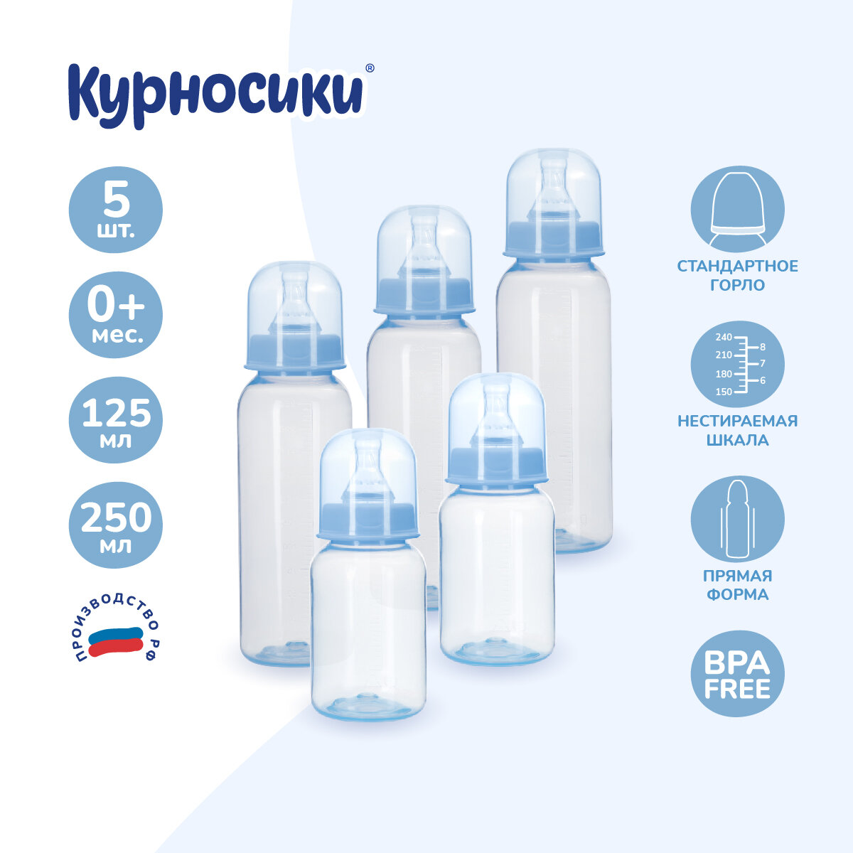 Бутылочка для кормления новорожденного Курносики с силиконовой соской молочной 250 мл, набор из 5 штук, голубой