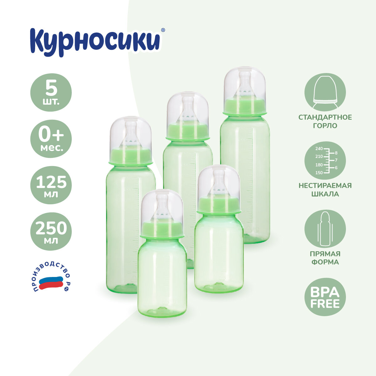 Бутылочка для кормления новорожденного Курносики с силиконовой соской молочной 250 мл, набор из 5 штук, зеленый