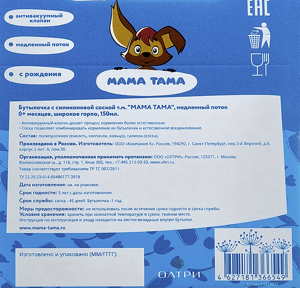 | Комплектация | Бутылочка для кормления МАМА ТАМА полипропиленовая с широким горлышком с силиконовой соской |