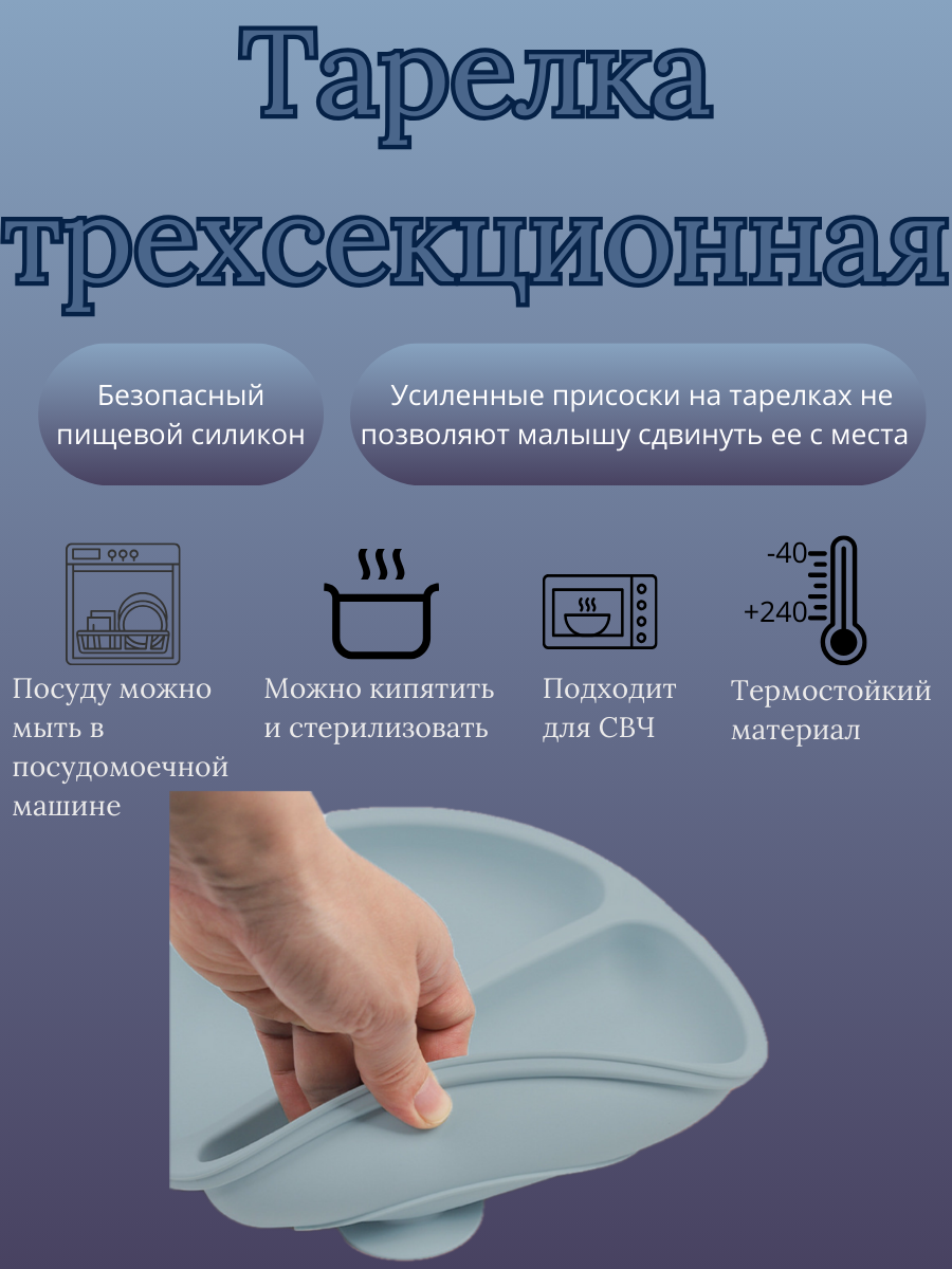 | Особенности | использование в СВЧ / можно мыть в посудомоечной машине / можно стерилизовать / на присоске / нескользящее покрытие / тарелка с секциями |
