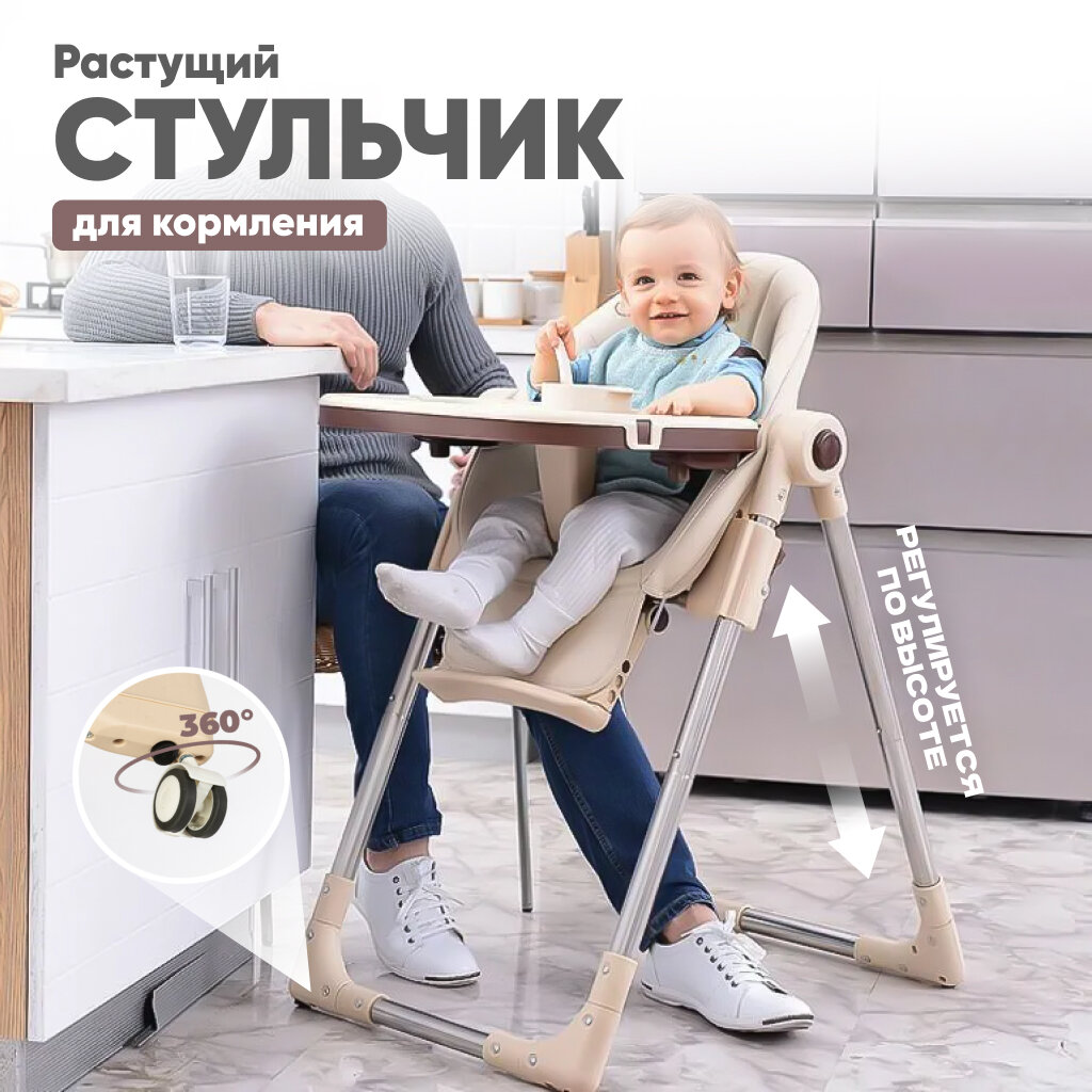 Стульчик SOLMAX для кормления ребенка, складной на колесиках со съемным столом детский, серо-коричневый