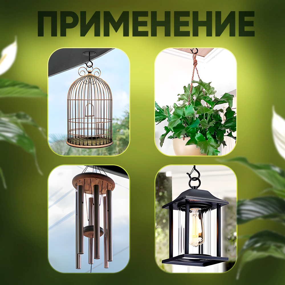 | Описание | кашпо, фонарь, гирлянда, столовые приборы, светильник и все, что вы захотите повесить, не слетят и не упадит с кронштейна с карабином |