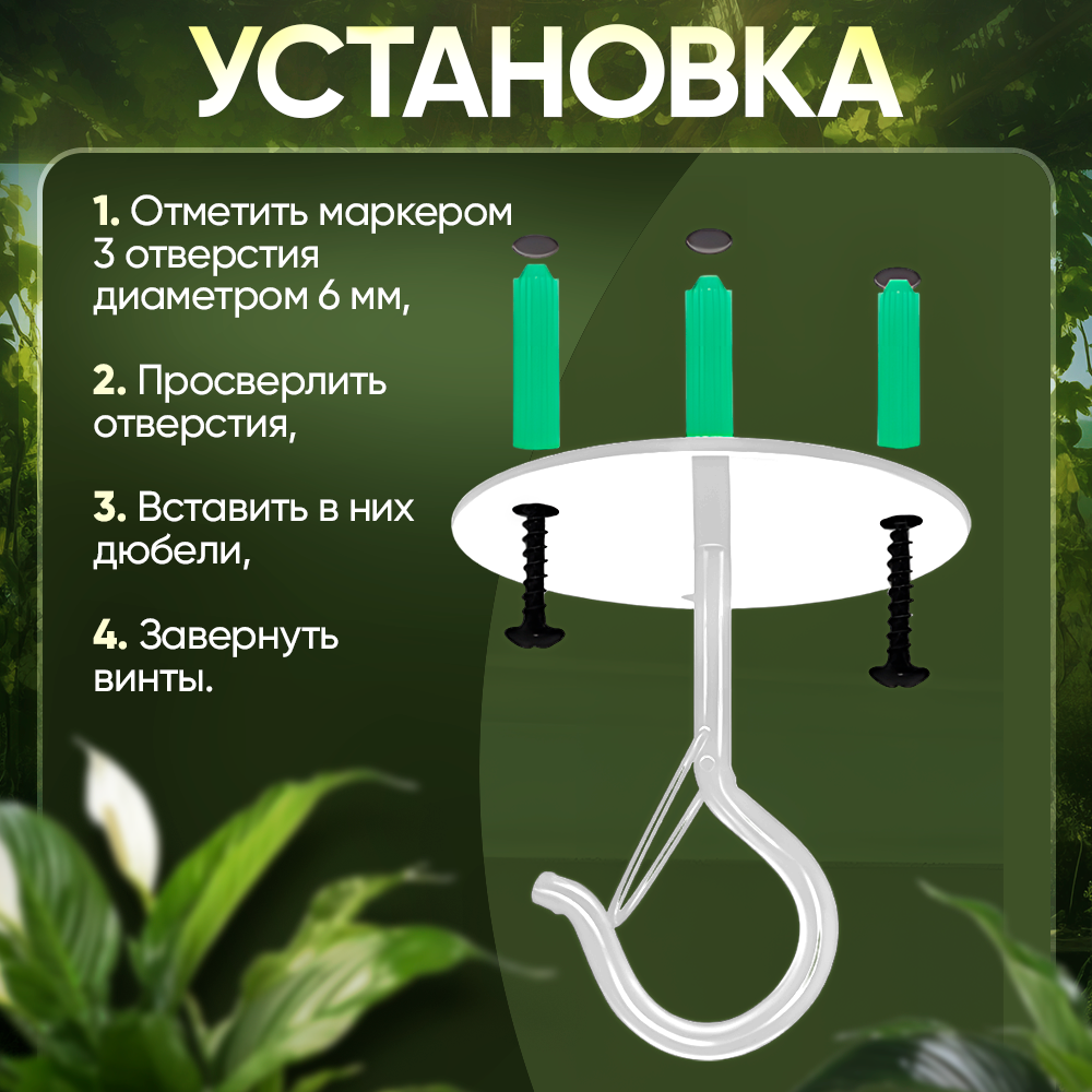 | Описание | кашпо, фонарь, гирлянда, столовые приборы, светильник и все, что вы захотите повесить, не слетят и не упадит с кронштейна с карабином |