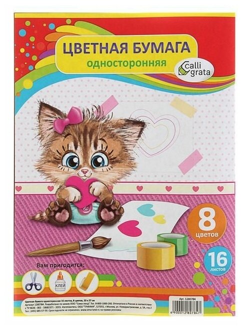 Бумага цветная А4, 16 листов, 8 цветов "Котёнок", газетная, на скобе В наборе1шт. интересное:
