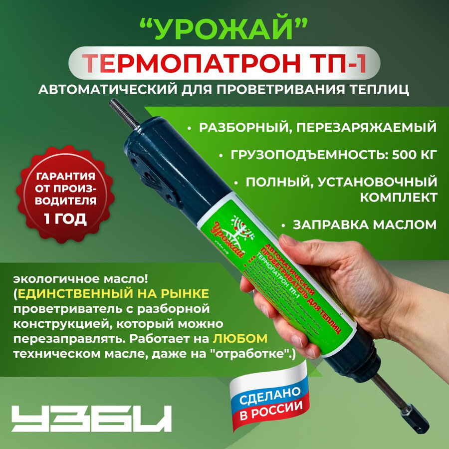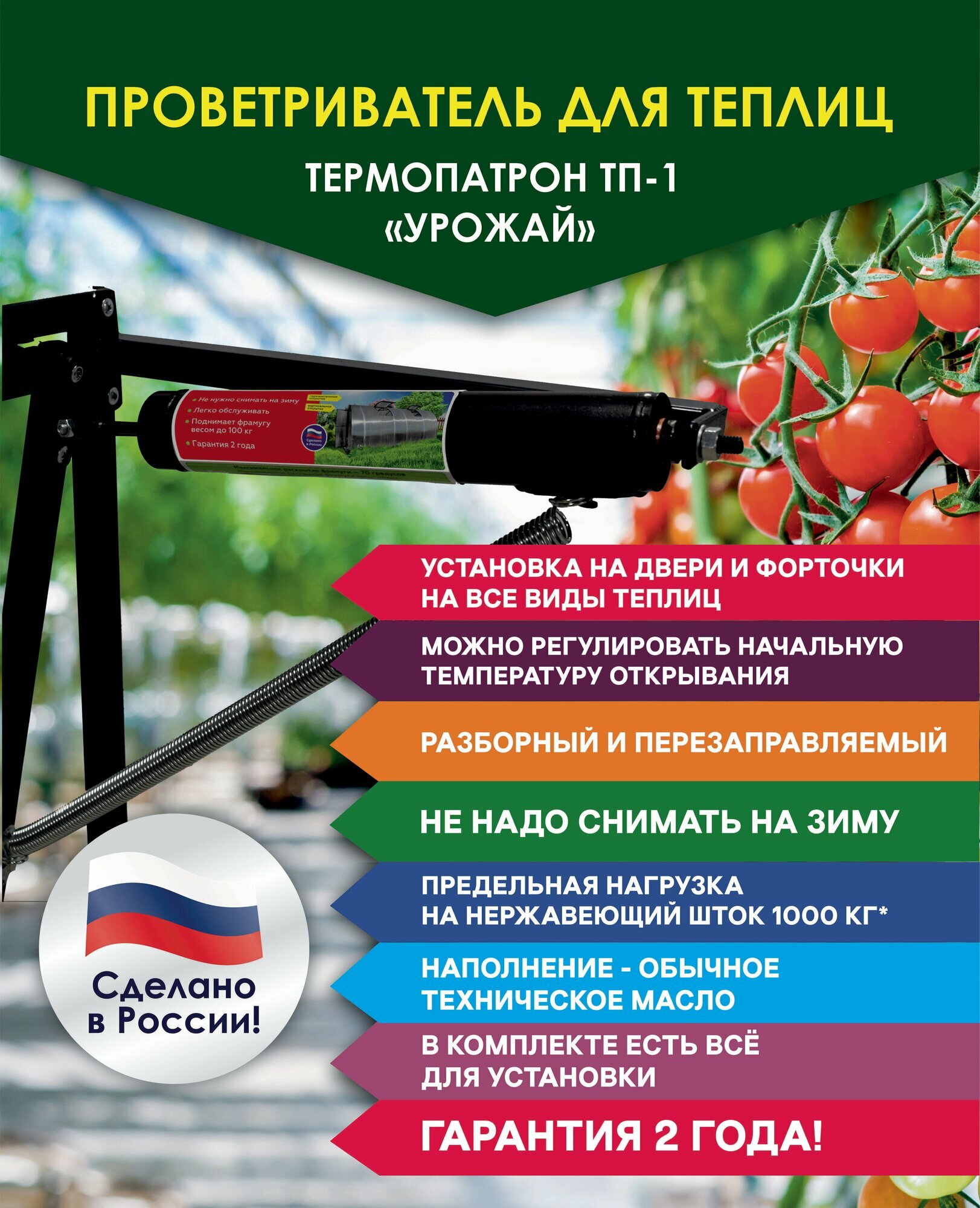 | Дополнительная информация | Мощный автоматический доводчик. Проветриватель дверей и форточек для теплицы Термопатрон Урожай ТП 01 с усилием до 100 кг и защитой от сильных порывов ветра. В комплекте есть подробная инструкция по сборке и эксплуатации. Внимание! В России появились дешёвые некачественные тепличные доводчики под маркой Термопатрон. Мы продаём автопроветриватели с длительной гарантией напрямую от производителя - завода УЗБИ. Опасайтесь поддельных термоприводов Термопатрон, предлагаемых Вам по низким ценам! |