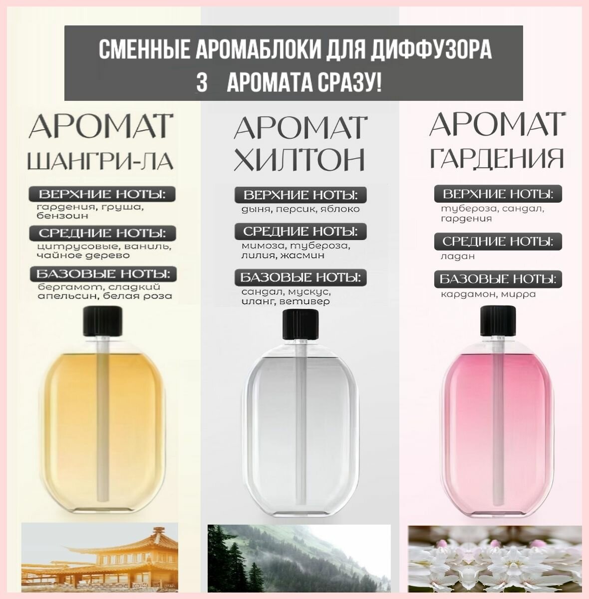 Духи для дома, 3 сменных аромаблока для аромадиффузера Жасмин, Гардения, Шангрила