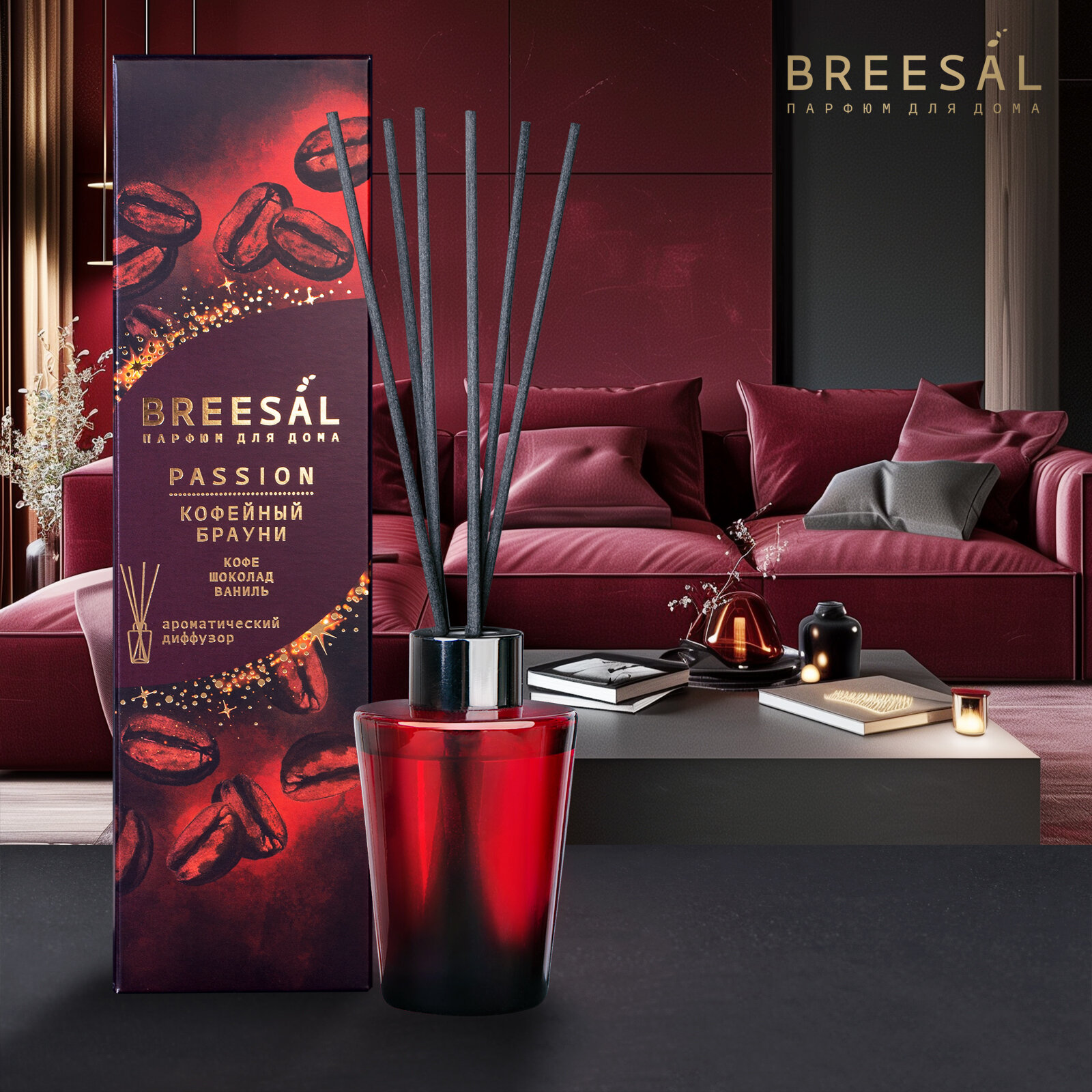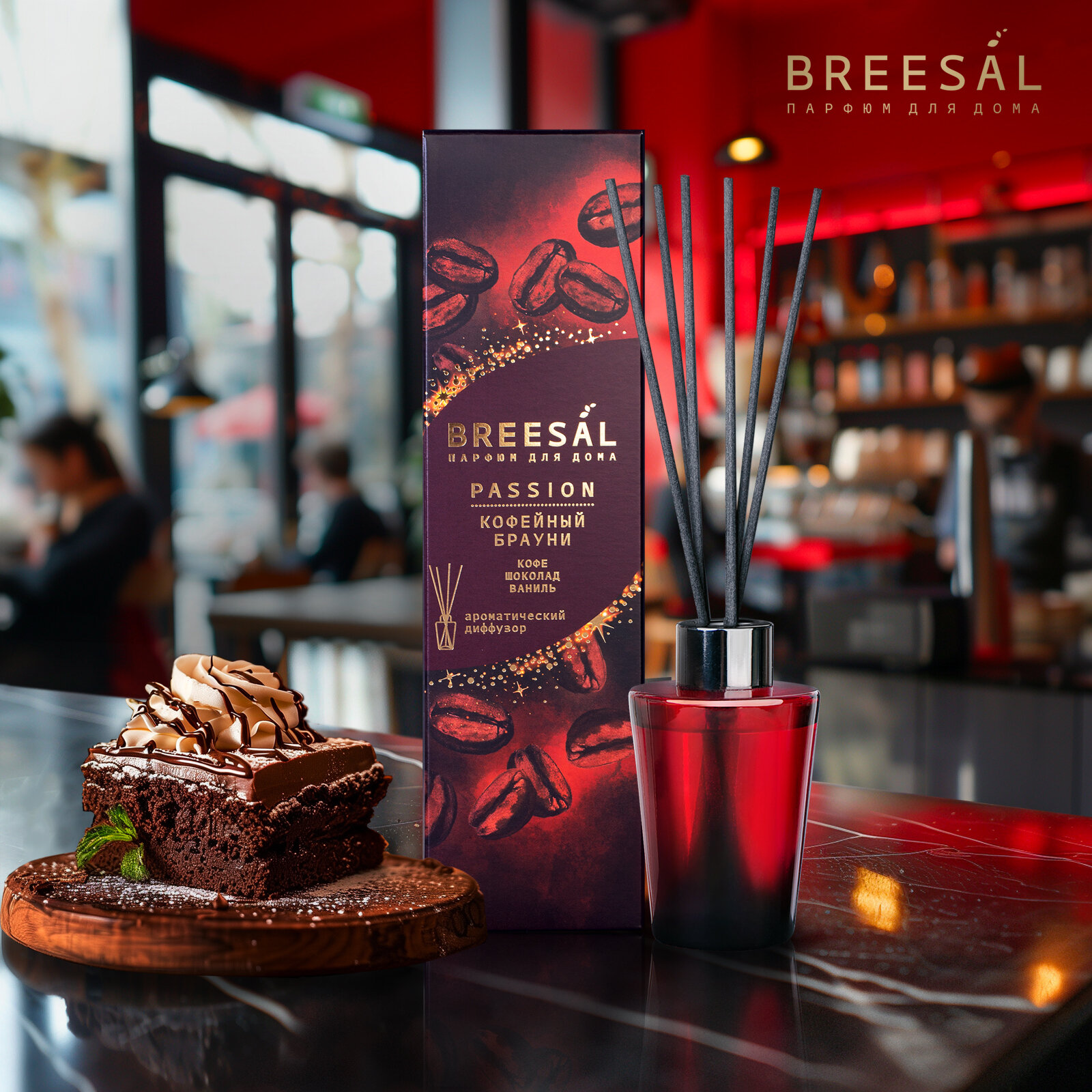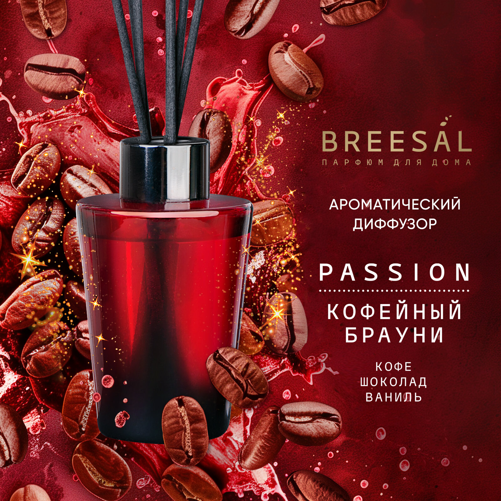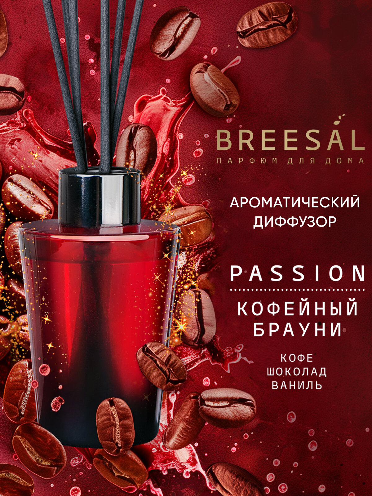 Диффузор для дома с палочками Breesal Passion ароматический диффузор Кофейный брауни, 70 мл