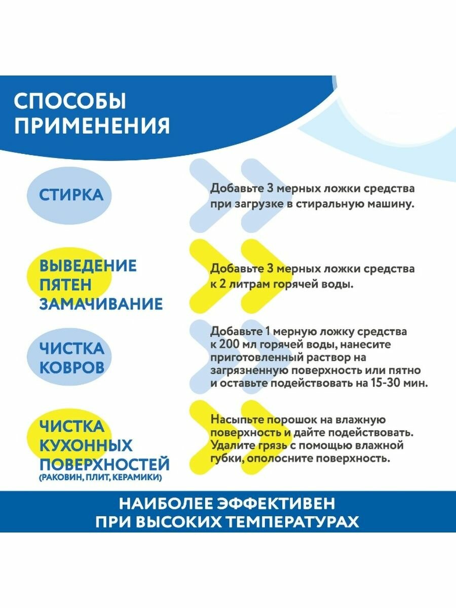 | Состав | карбонат натрия более 30%, перкарбонат более 30%, НПАВ менее 5%, АПАВ менее 5%, активатор стирки менее 5%, энзимы менее 5%. |