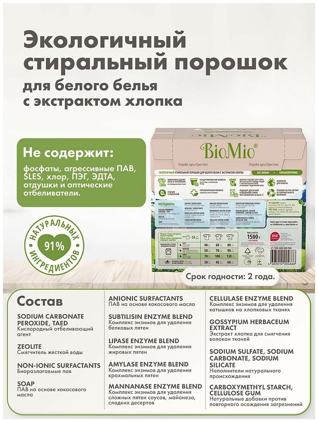 BioMio Стиральный порошок для белого белья, 1.5 кг, (2 шт) интересное: