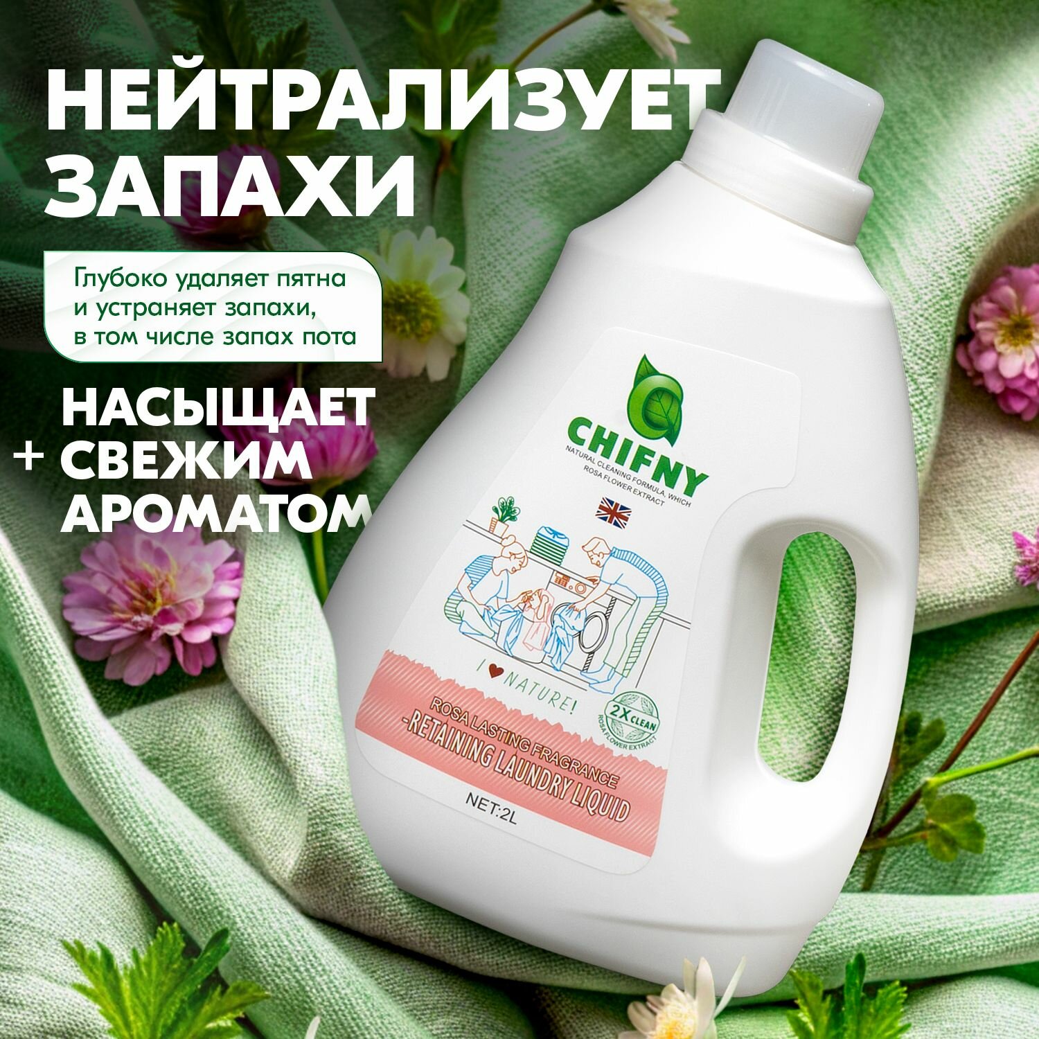 Гель для стирки + кондиционер для белья, CHIFNY аромат розы 2л, универсальный 2 в 1 интересное: